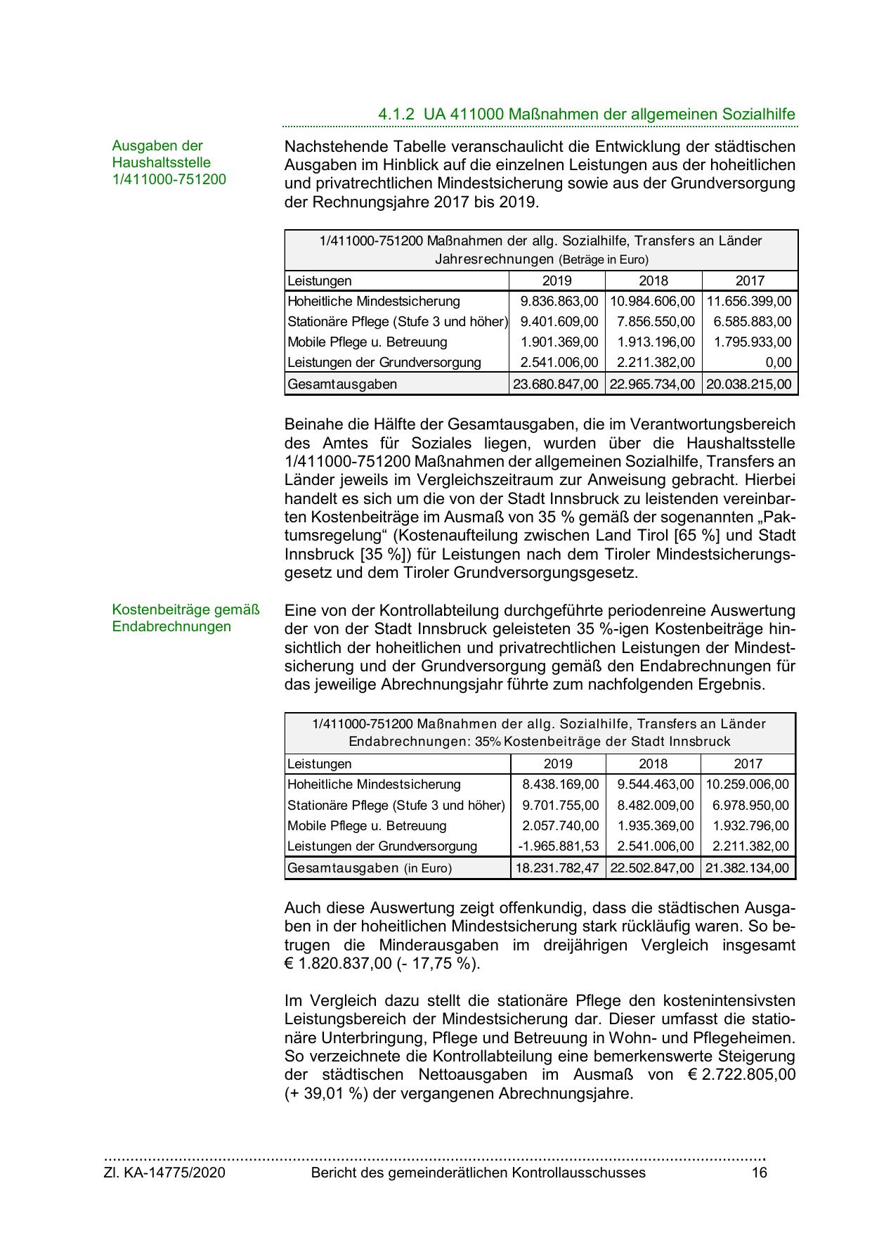 der von der Stadt Innsbruck geleisteten 35 %-igen Kostenbeiträge hinsichtlich der hoheitlichen und privatrechtlichen Leistungen der Mindestsicherung und der Grundversorgung gemäß den Endabrechnungen für