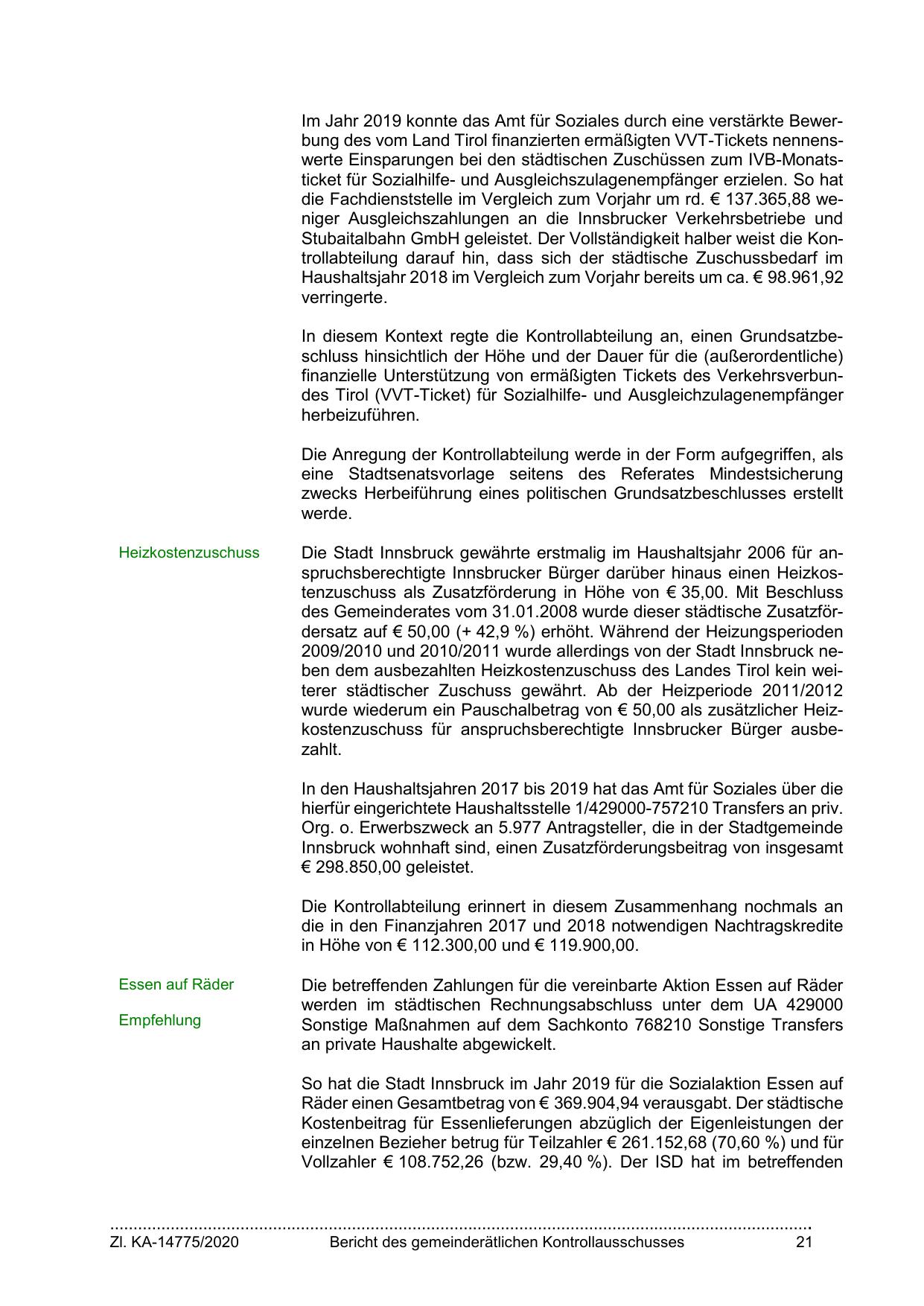 wurde wiederum ein Pauschalbetrag von € 50,00 als zusätzlicher Heizkostenzuschuss für anspruchsberechtigte Innsbrucker Bürger ausbezahlt.