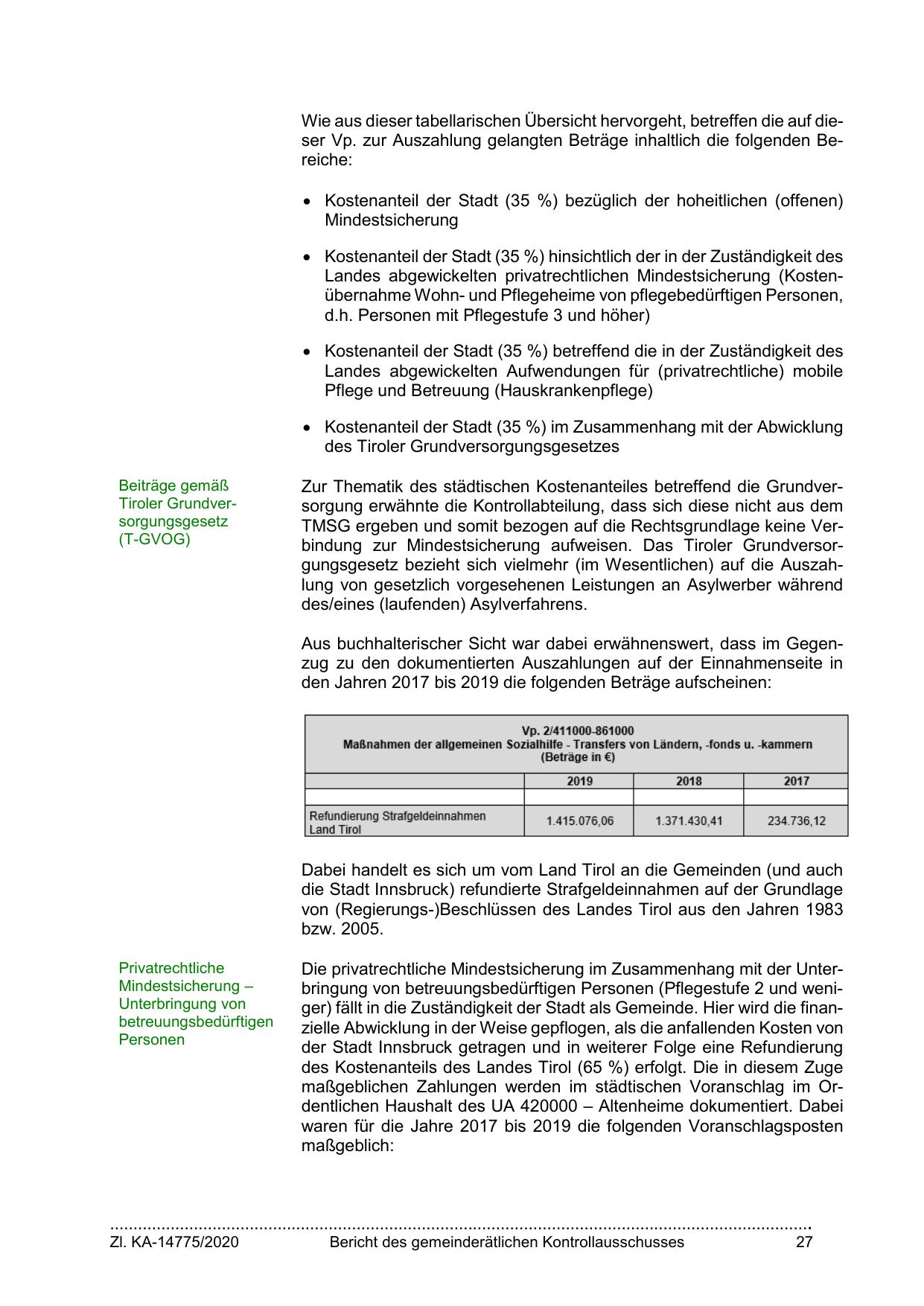 Zur Thematik des städtischen Kostenanteiles betreffend die Grundversorgung erwähnte die Kontrollabteilung, dass sich diese nicht aus dem