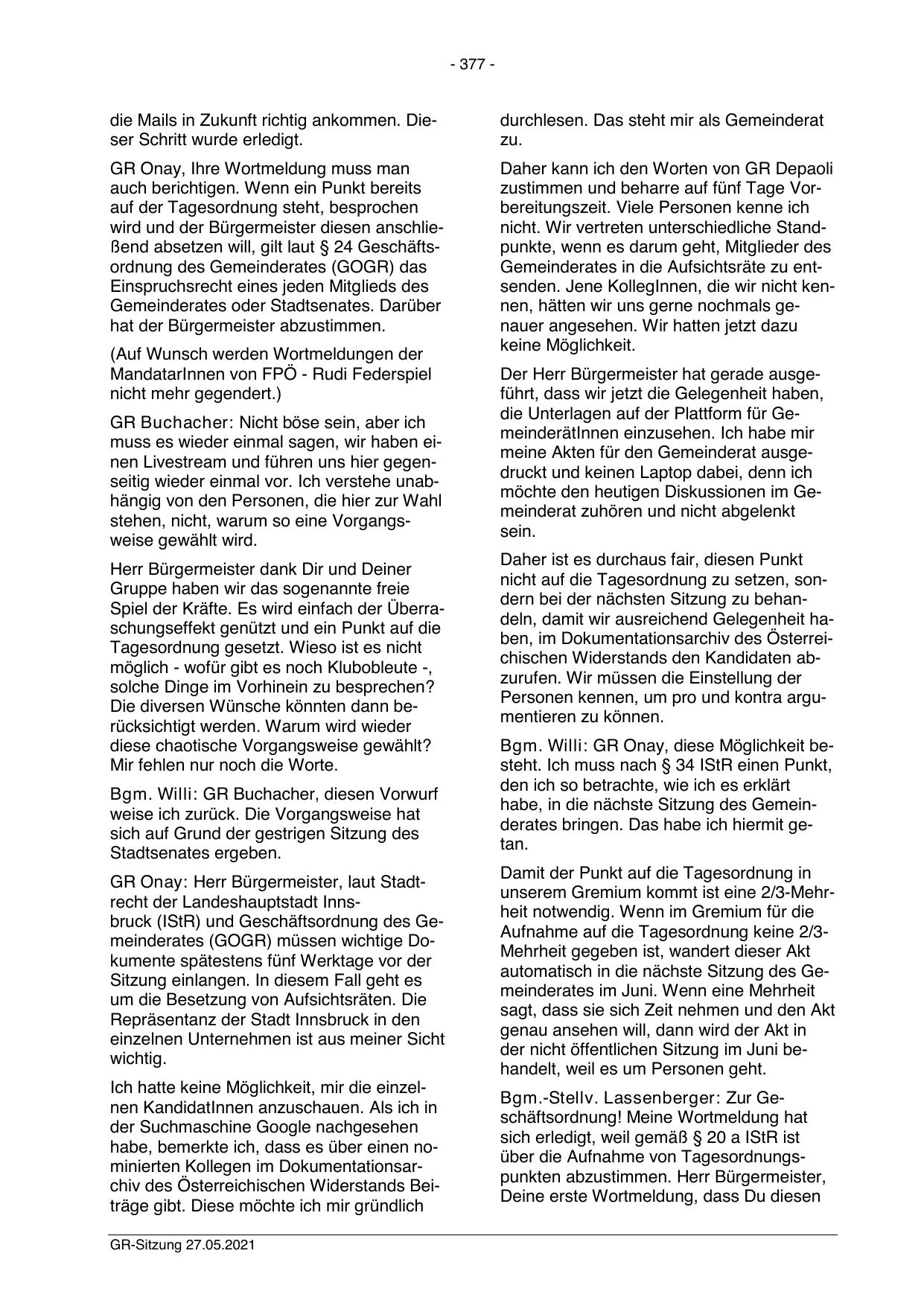GR Onay: Herr Bürgermeister, laut Stadtrecht der Landeshauptstadt Innsbruck (IStR) und Geschäftsordnung des Gemeinderates (GOGR) müssen wichtige Dokumente spätestens fünf Werktage vor der