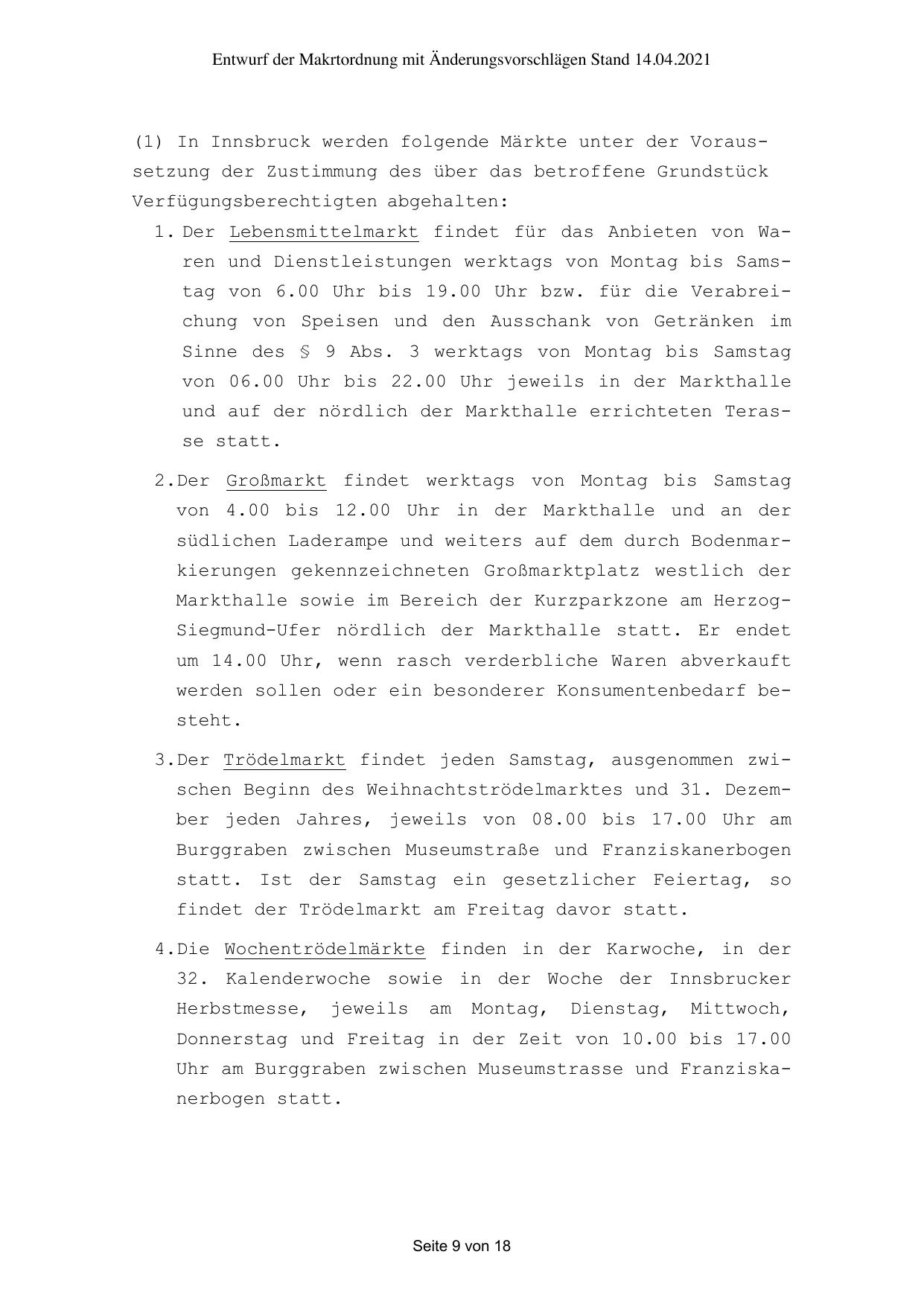 (1) In Innsbruck werden folgende Märkte unter der Voraussetzung der Zustimmung des über das betroffene Grundstück