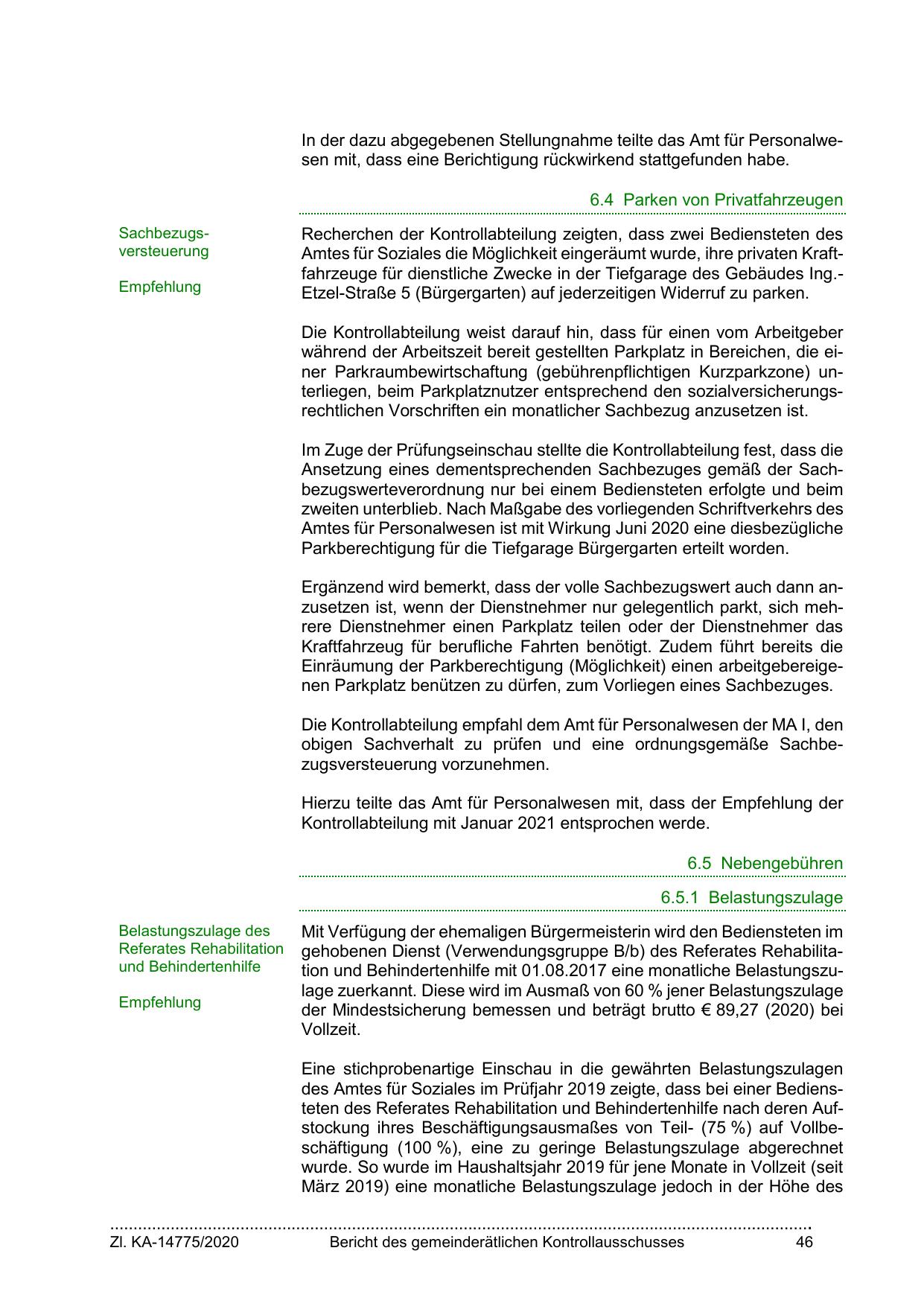 des Amtes für Soziales im Prüfjahr 2019 zeigte, dass bei einer Bediensteten des Referates Rehabilitation und Behindertenhilfe nach deren Aufstockung ihres Beschäftigungsausmaßes von Teil- (75 %) auf Vollbeschäftigung (100 %), eine zu geringe Belastungszulage abgerechnet