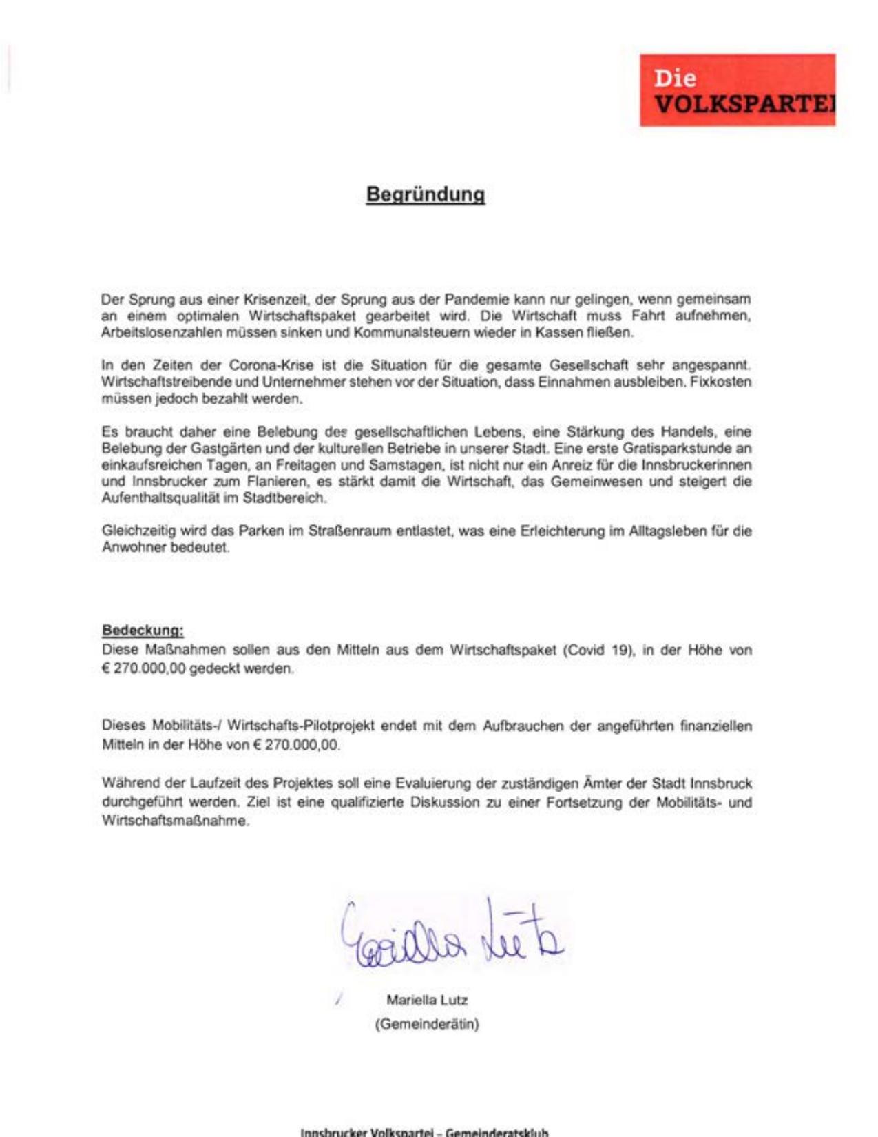 Belebung der Gastgärten und der kulturellen Betriebe in unserer Stadt. Eine erste Gratisparkstunde an