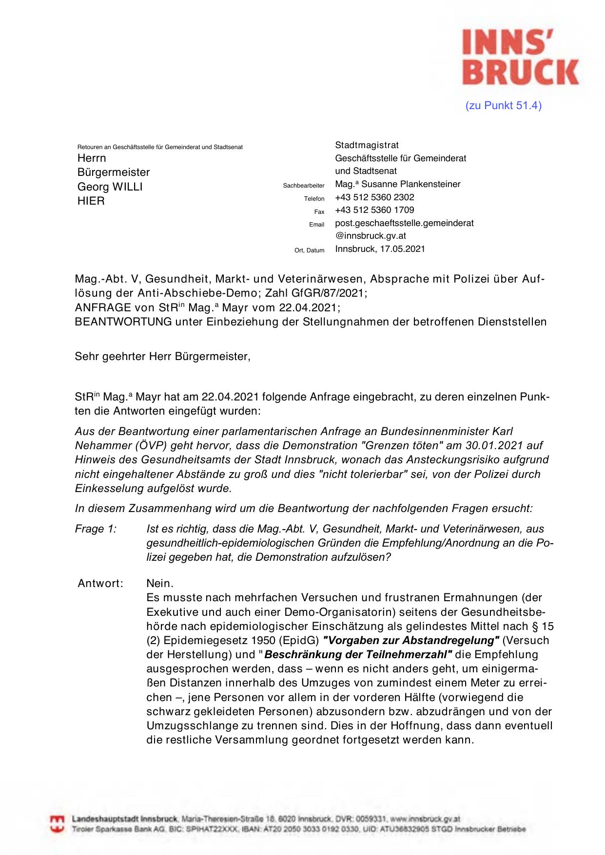 Mag.-Abt. V, Gesundheit, Markt- und Veterinärwesen, Absprache mit Polizei über Auflösung der Anti-Abschiebe-Demo; Zahl GfGR/87/2021;