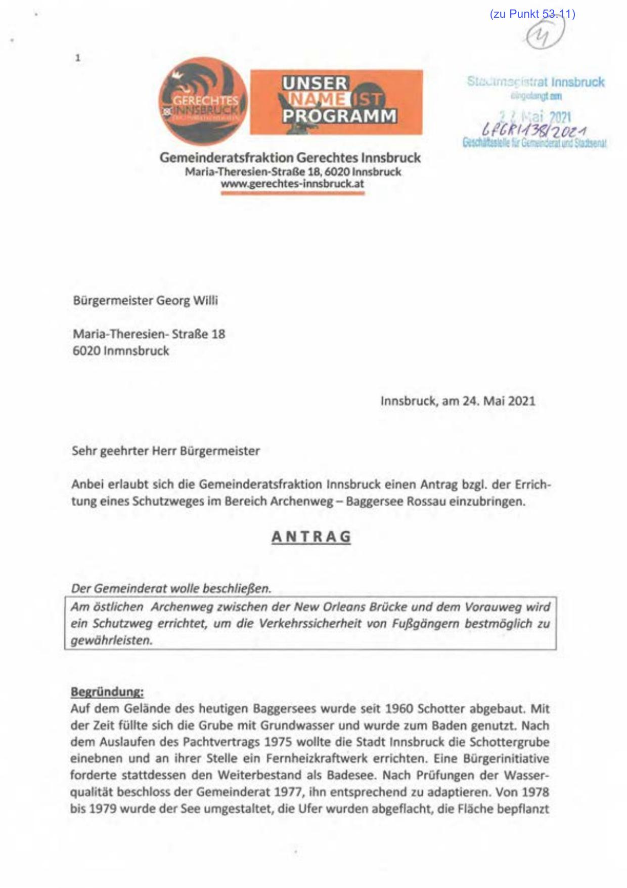 Anbei erlaubt sich die Gemeinderatsfraktion Innsbruck einen Antrag bzgl. der Errichtung eines Schutzweges im Bereich Archenweg- Baggersee Rossau einzubringen.