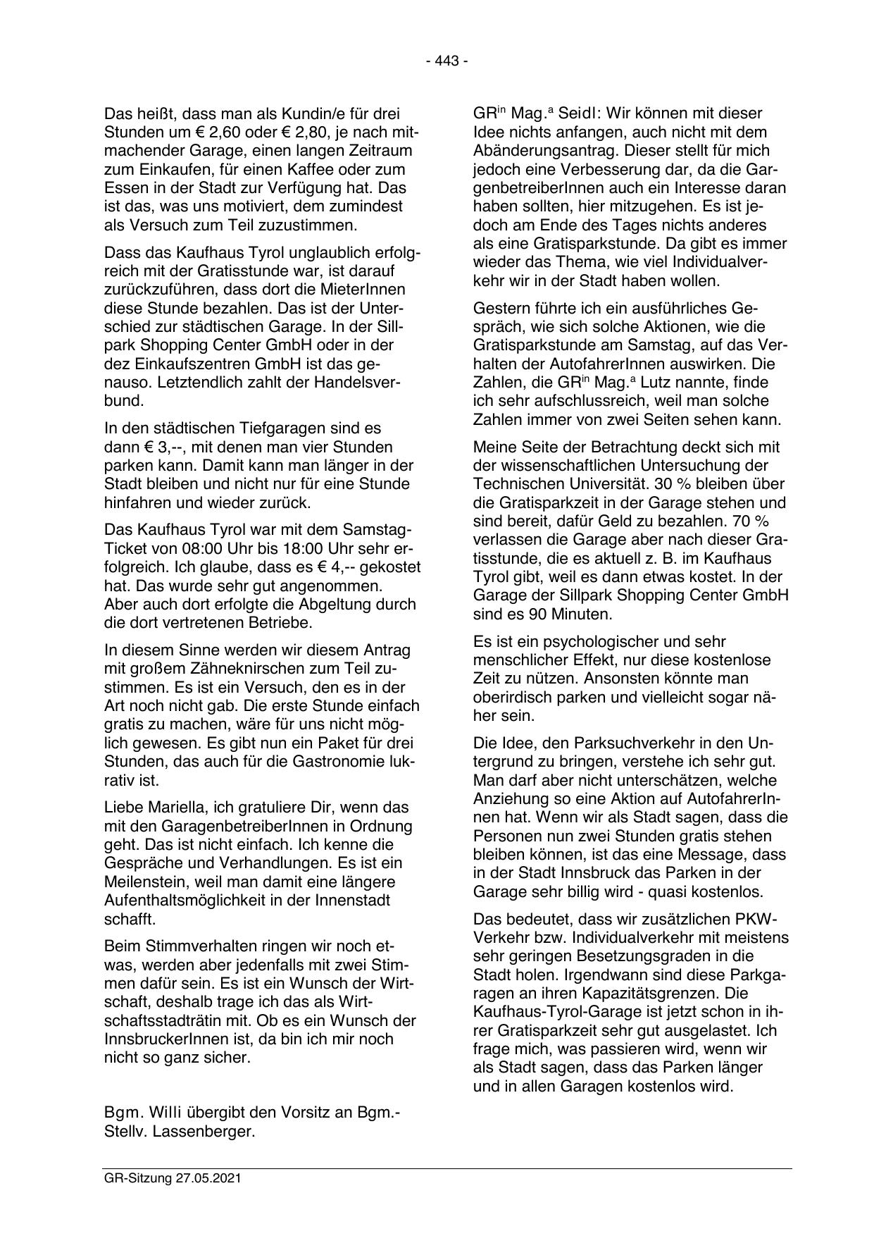 diese Stunde bezahlen. Das ist der Unterschied zur städtischen Garage. In der Sillpark Shopping Center GmbH oder in der