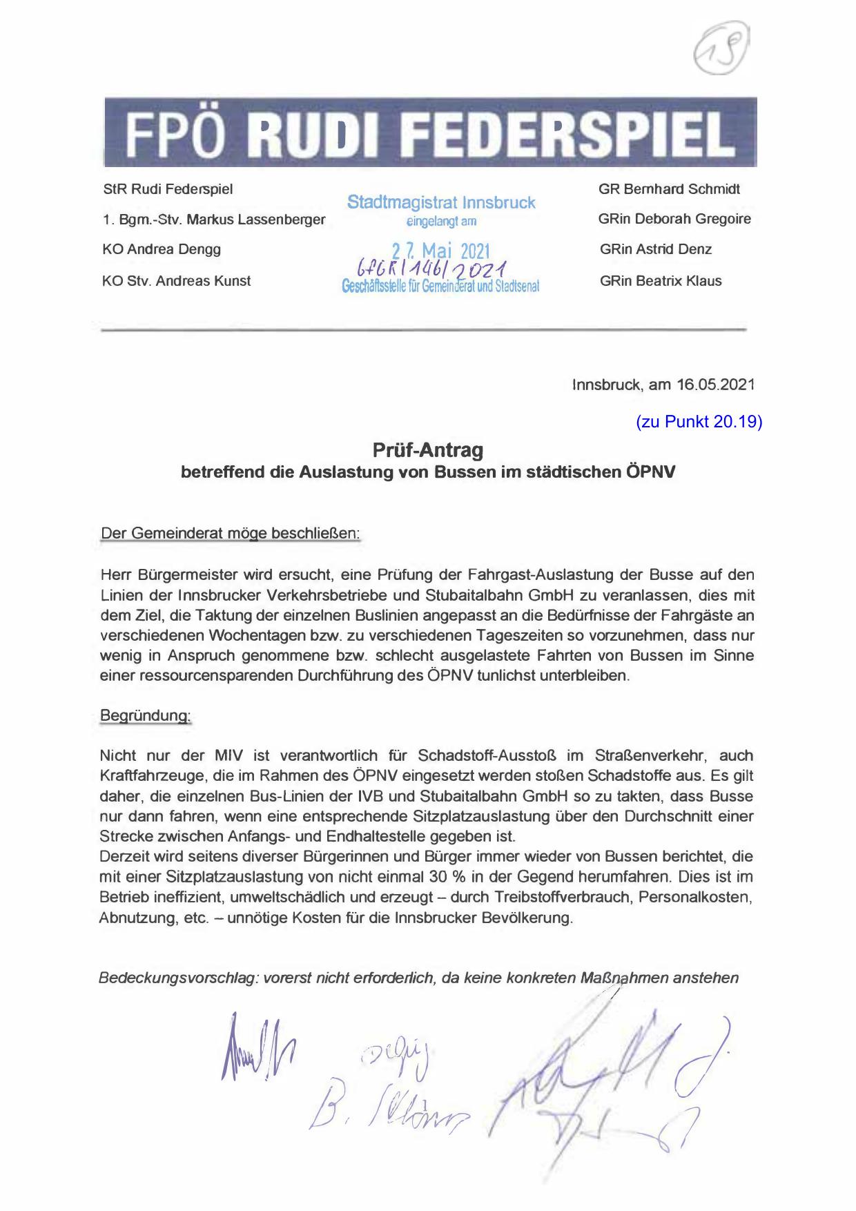 Herr Bürgermeister wird ersucht, eine Prüfung der Fahrgast-Auslastung der Busse auf den