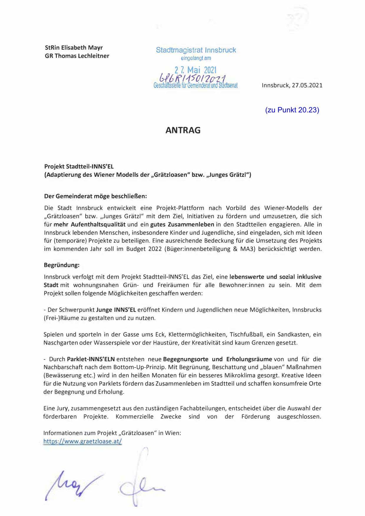 (Adaptierung des Wiener Modells der „Grätzloasen" bzw. ,,Junges Grätzl")