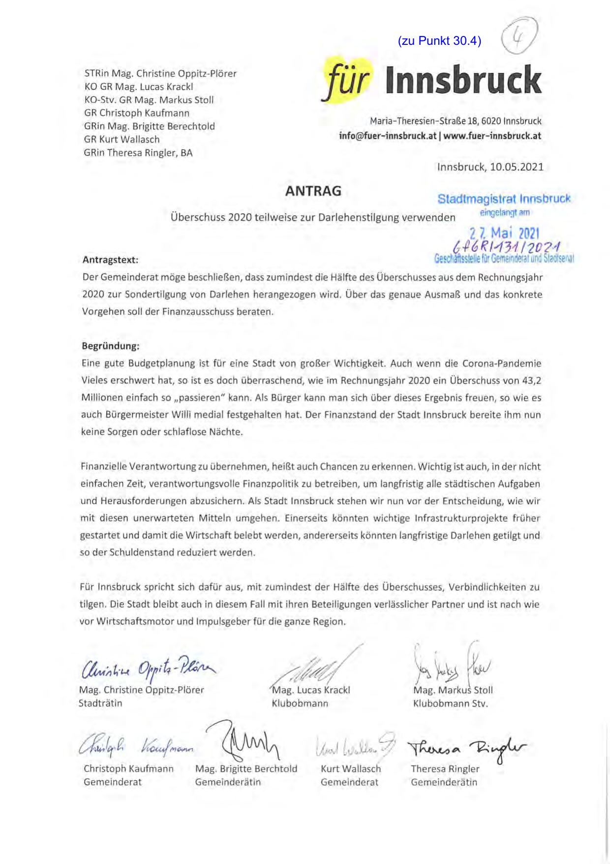 Für Innsbruck spricht sich dafür aus, mit zumindest der Hälfte des Überschusses, Verbindlichkeiten zu