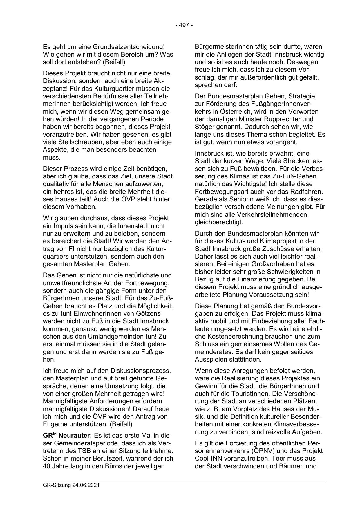 GRin Neurauter: Es ist das erste Mal in dieser Gemeinderatsperiode, dass ich als Vertreterin des TSB an einer Sitzung teilnehme.