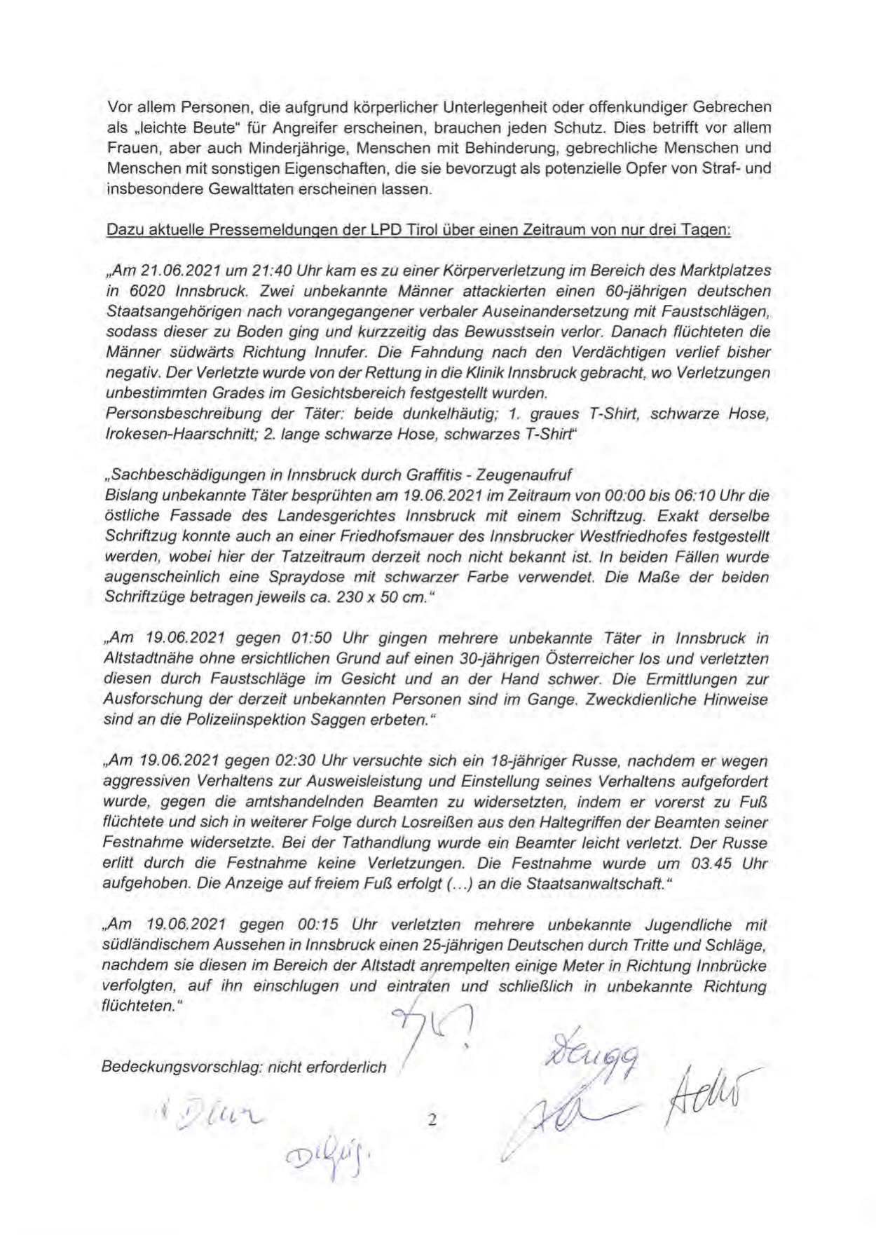„Am 19.06.2021 gegen 01:50 Uhr gingen mehrere unbekannte Täter in Innsbruck in