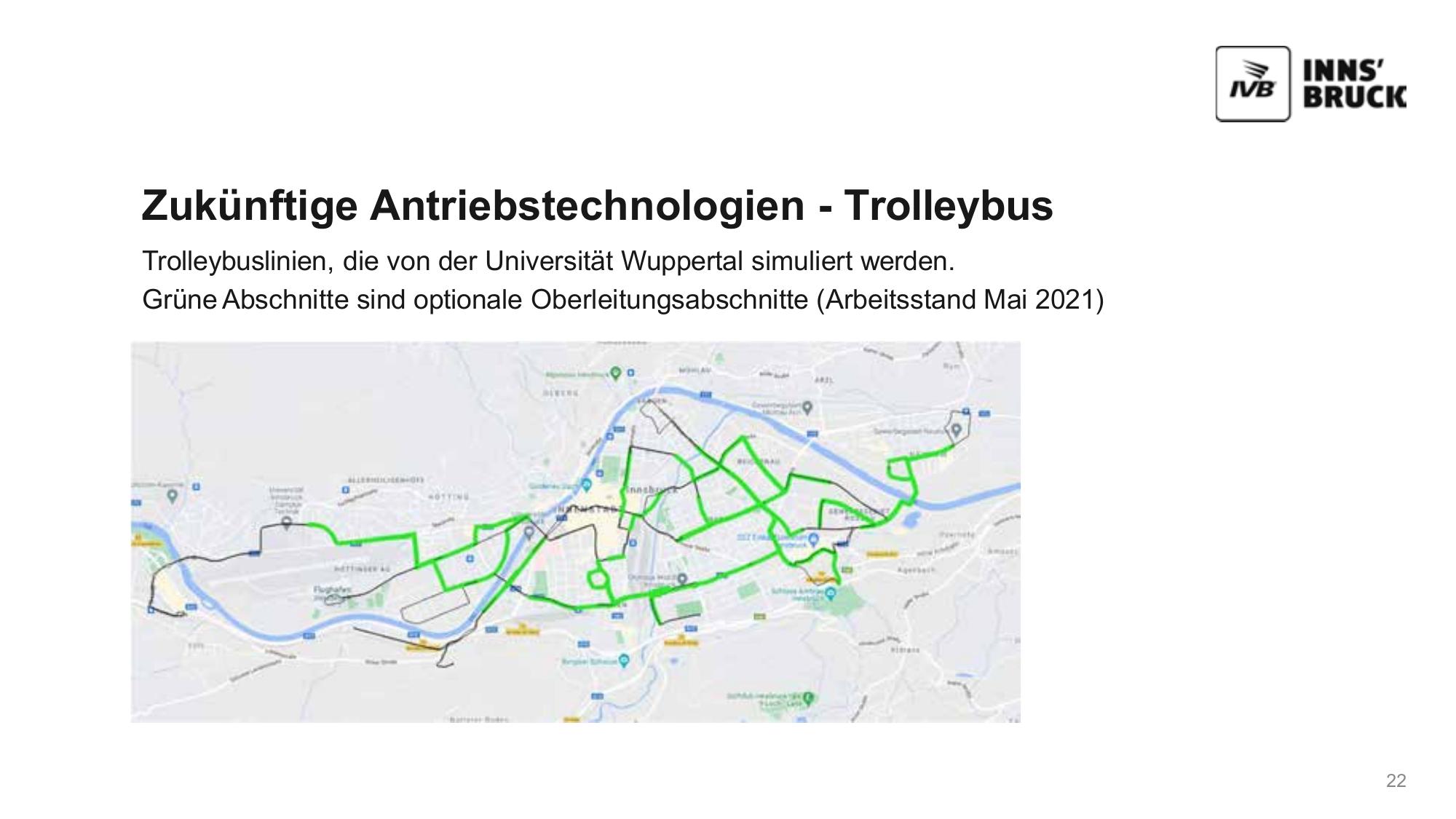 Grüne Abschnitte sind optionale Oberleitungsabschnitte (Arbeitsstand Mai 2021)