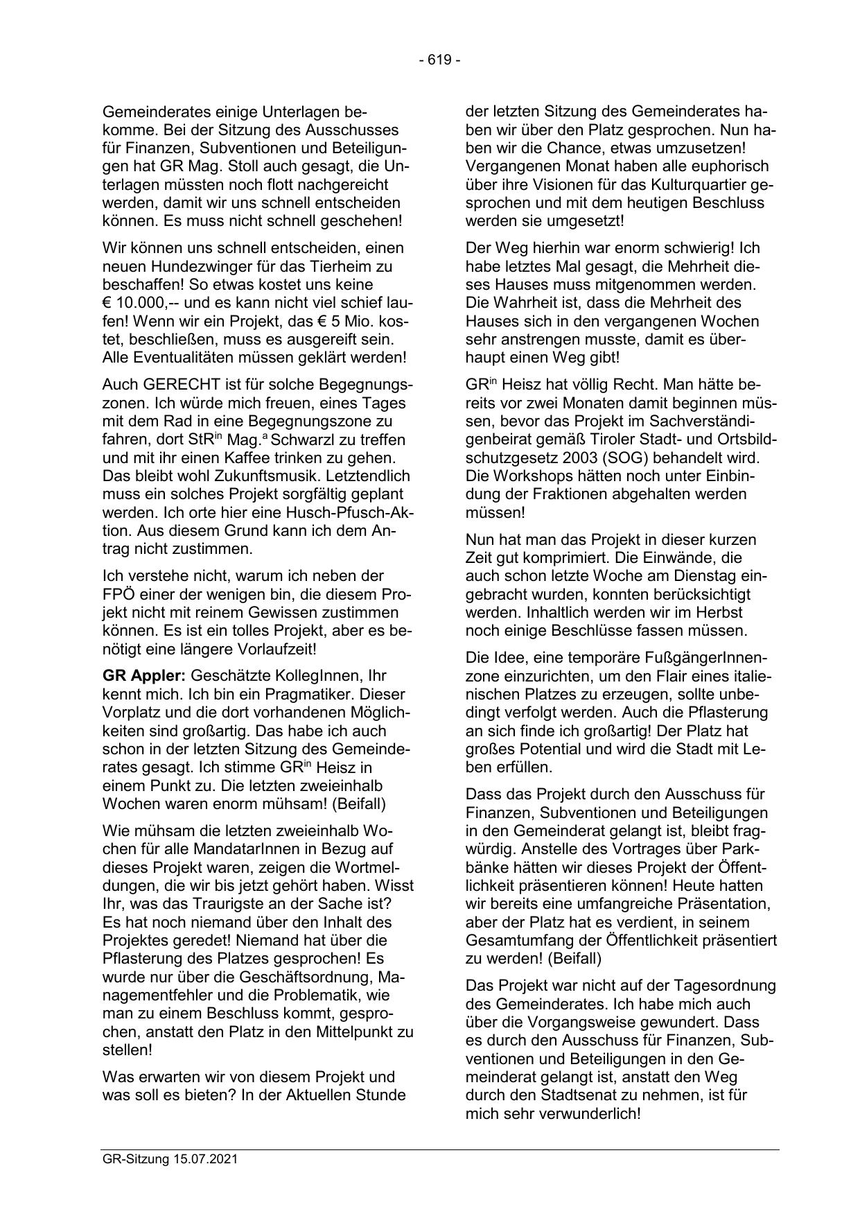 GRin Heisz hat völlig Recht. Man hätte bereits vor zwei Monaten damit beginnen müssen, bevor das Projekt im Sachverständigenbeirat gemäß Tiroler Stadt- und Ortsbildschutzgesetz 2003 (SOG) behandelt wird.