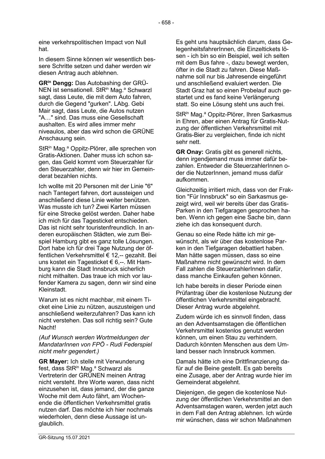 Gleichzeitig irritiert mich, dass von der Fraktion "Für Innsbruck" so ein Sarkasmus gezeigt wird, weil wir bereits über das GratisParken in den Tiefgaragen gesprochen haben. Wenn ich gegen eine Sache bin, dann