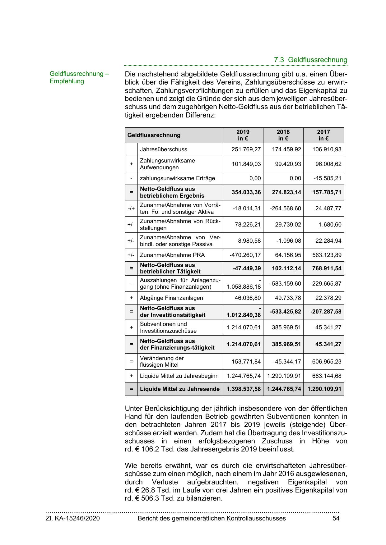 Die nachstehend abgebildete Geldflussrechnung gibt u.a. einen Überblick über die Fähigkeit des Vereins, Zahlungsüberschüsse zu erwirtschaften, Zahlungsverpflichtungen zu erfüllen und das Eigenkapital zu
