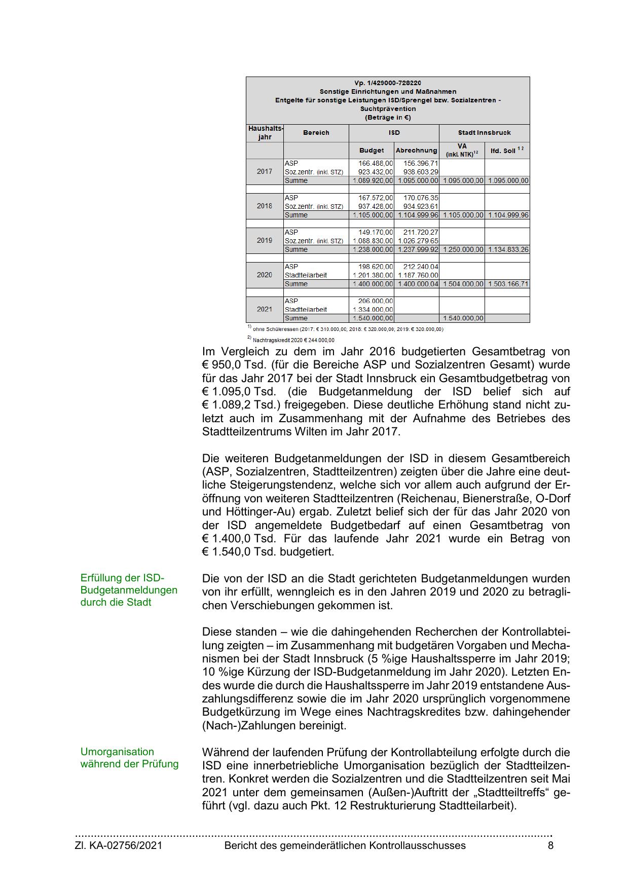 Diese standen – wie die dahingehenden Recherchen der Kontrollabteilung zeigten – im Zusammenhang mit budgetären Vorgaben und Mechanismen bei der Stadt Innsbruck (5 %ige Haushaltssperre im Jahr 2019;