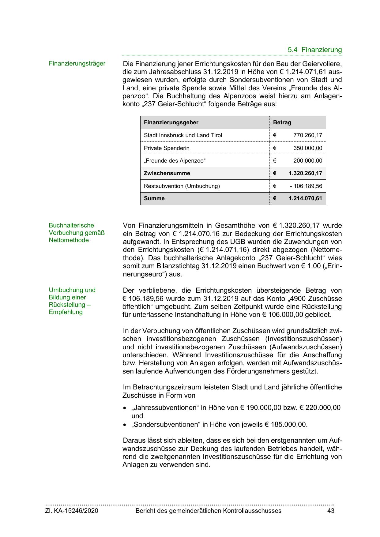 den Errichtungskosten (€ 1.214.071,16) direkt abgezogen (Nettomethode). Das buchhalterische Anlagekonto „237 Geier-Schlucht“ wies