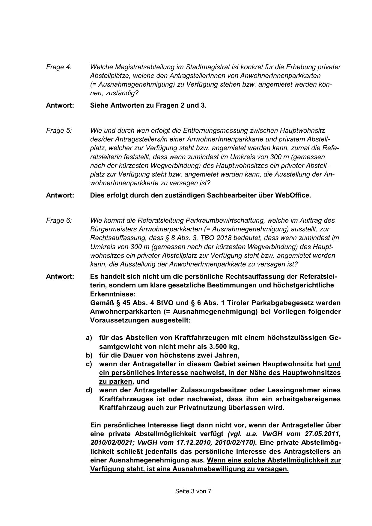 nach der kürzesten Wegverbindung) des Hauptwohnsitzes ein privater Abstellplatz zur Verfügung steht bzw. angemietet werden kann, die Ausstellung der AnwohnerInnenparkkarte zu versagen ist?