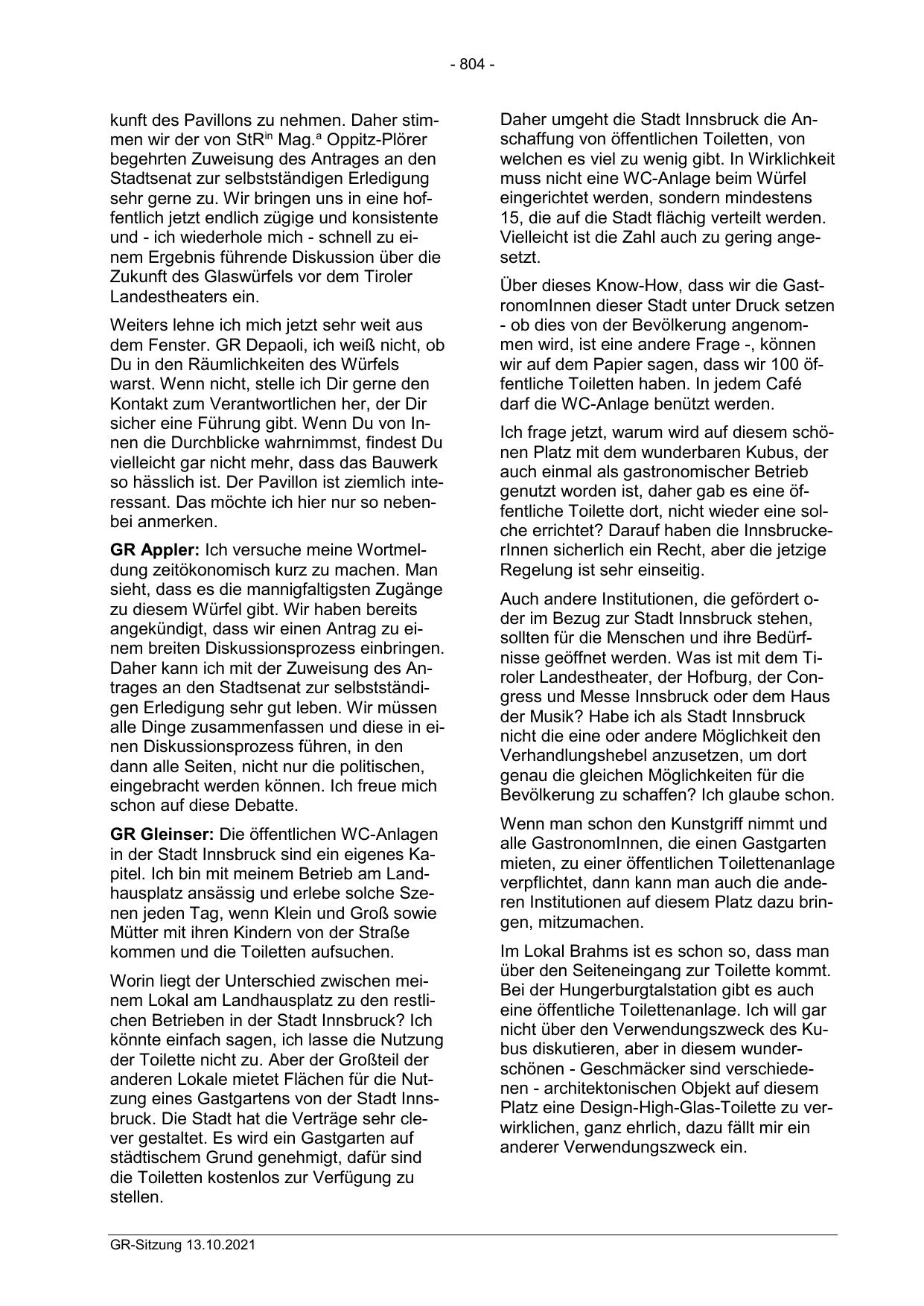 genutzt worden ist, daher gab es eine öffentliche Toilette dort, nicht wieder eine solche errichtet? Darauf haben die InnsbruckerInnen sicherlich ein Recht, aber die jetzige