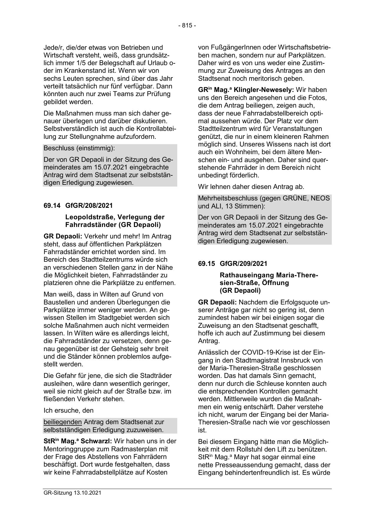 Der von GR Depaoli in der Sitzung des Gemeinderates am 15.07.2021 eingebrachte