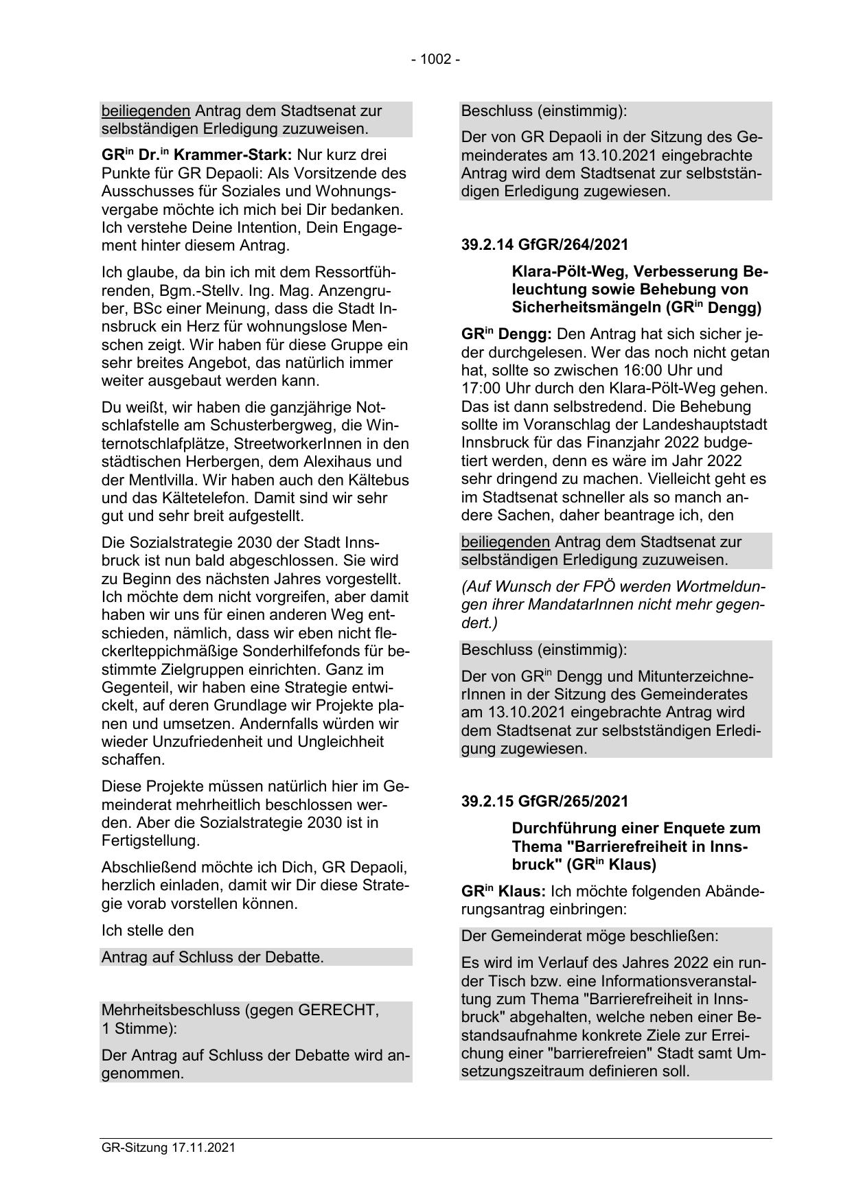Der von GR Depaoli in der Sitzung des Gemeinderates am 13.10.2021 eingebrachte
