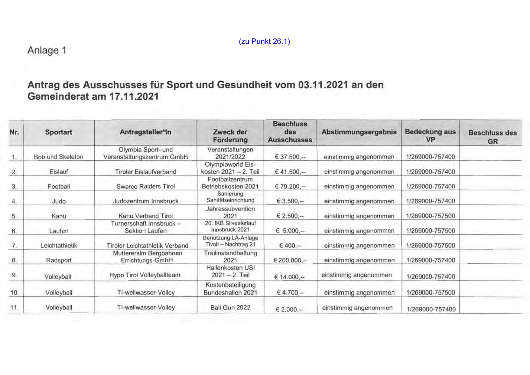 Antrag des Ausschusses für Sport und Gesundheit vom 03.11.2021 an den