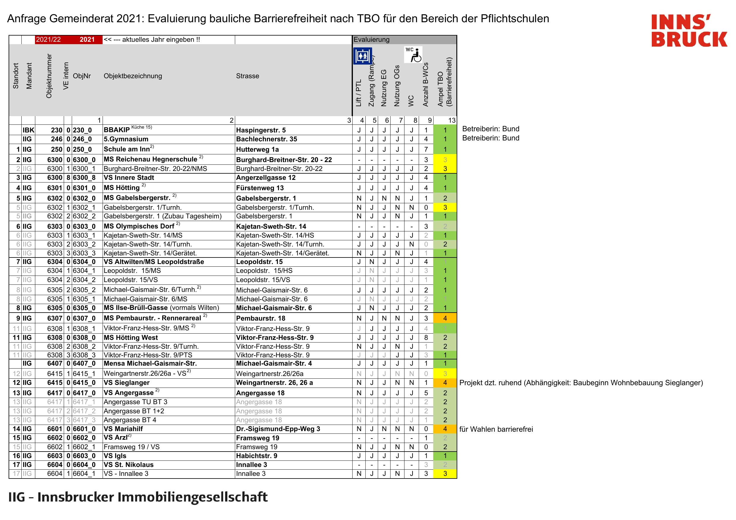 Anfrage Gemeinderat 2021: Evaluierung bauliche Barrierefreiheit nach TBO für den Bereich der Pflichtschulen