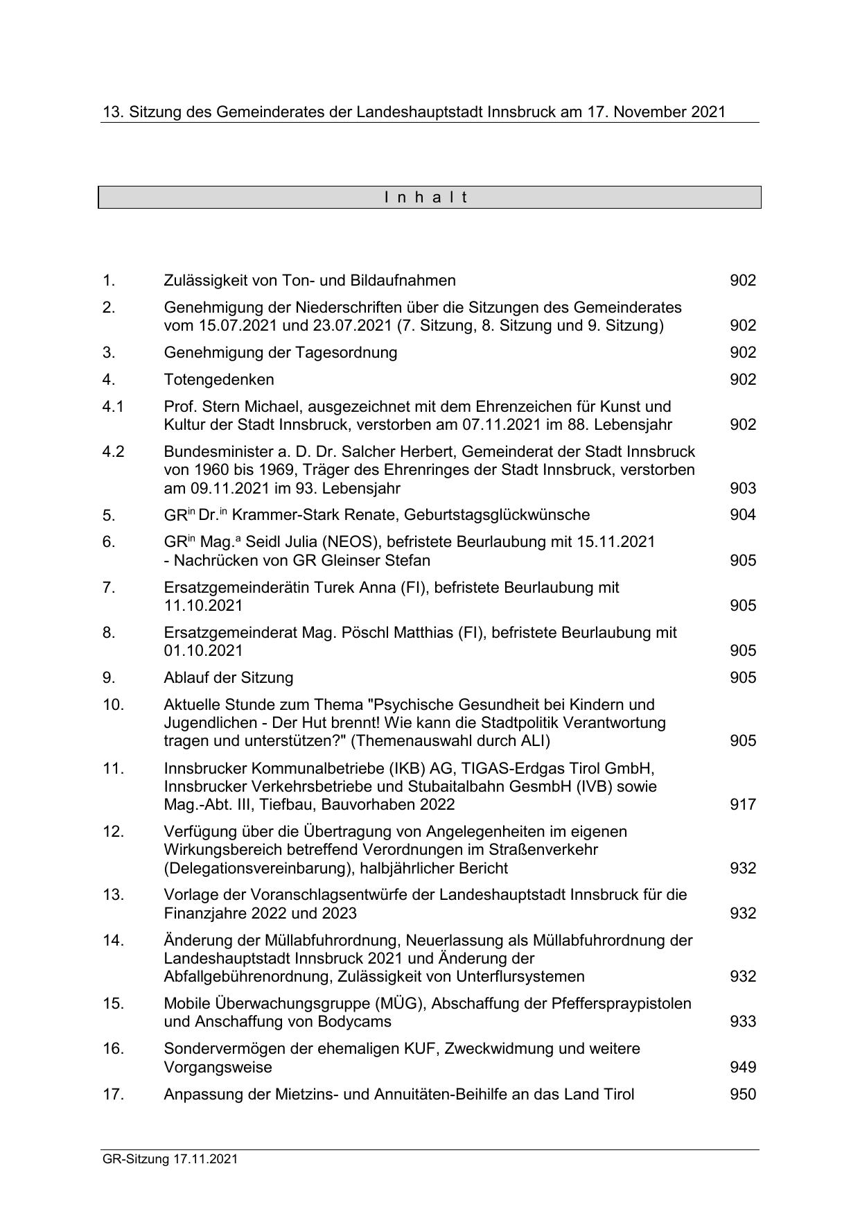 13. Sitzung des Gemeinderates der Landeshauptstadt Innsbruck am 17. November 2021