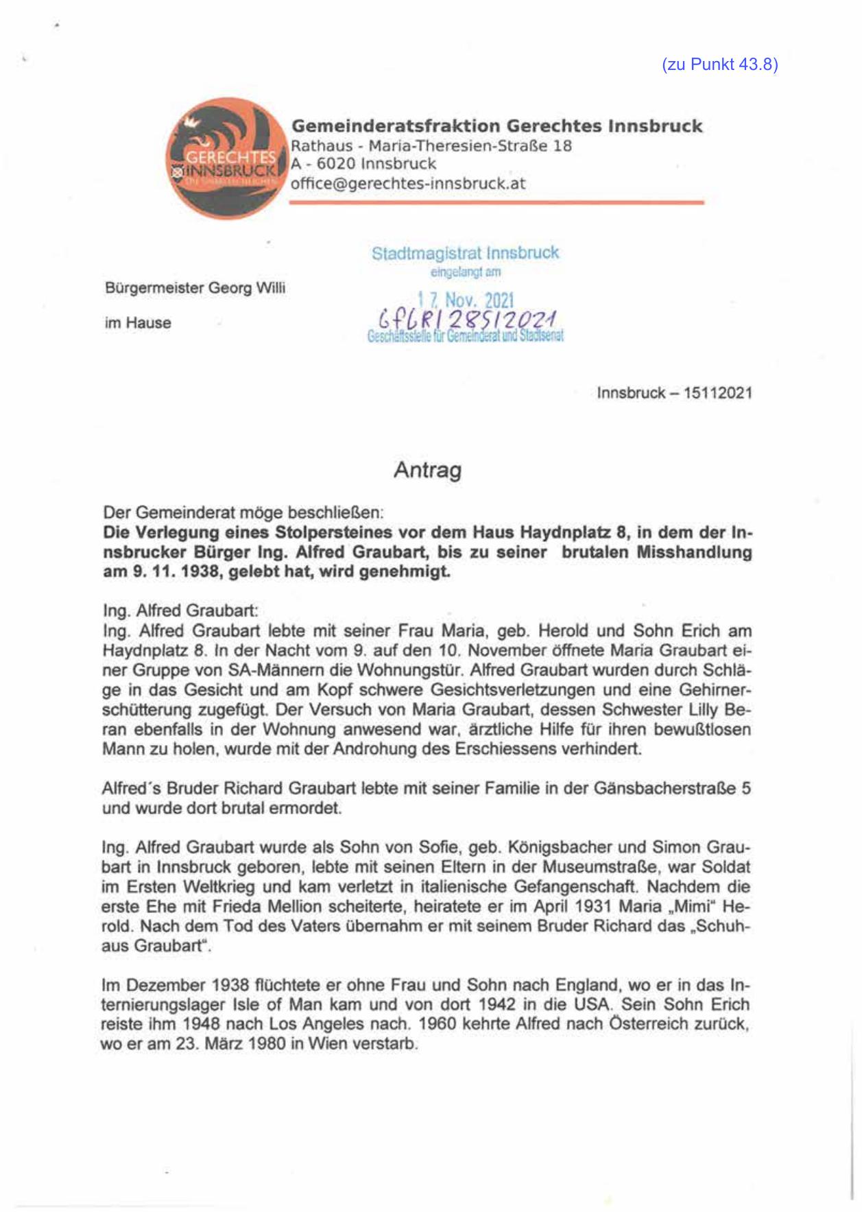 Ing. Alfred Graubart wurde als Sohn von Softe, geb. Königsbacher und Simon Graubart in Innsbruck geboren, lebte mit seinen Eltern in der Museumstraße, war Soldat