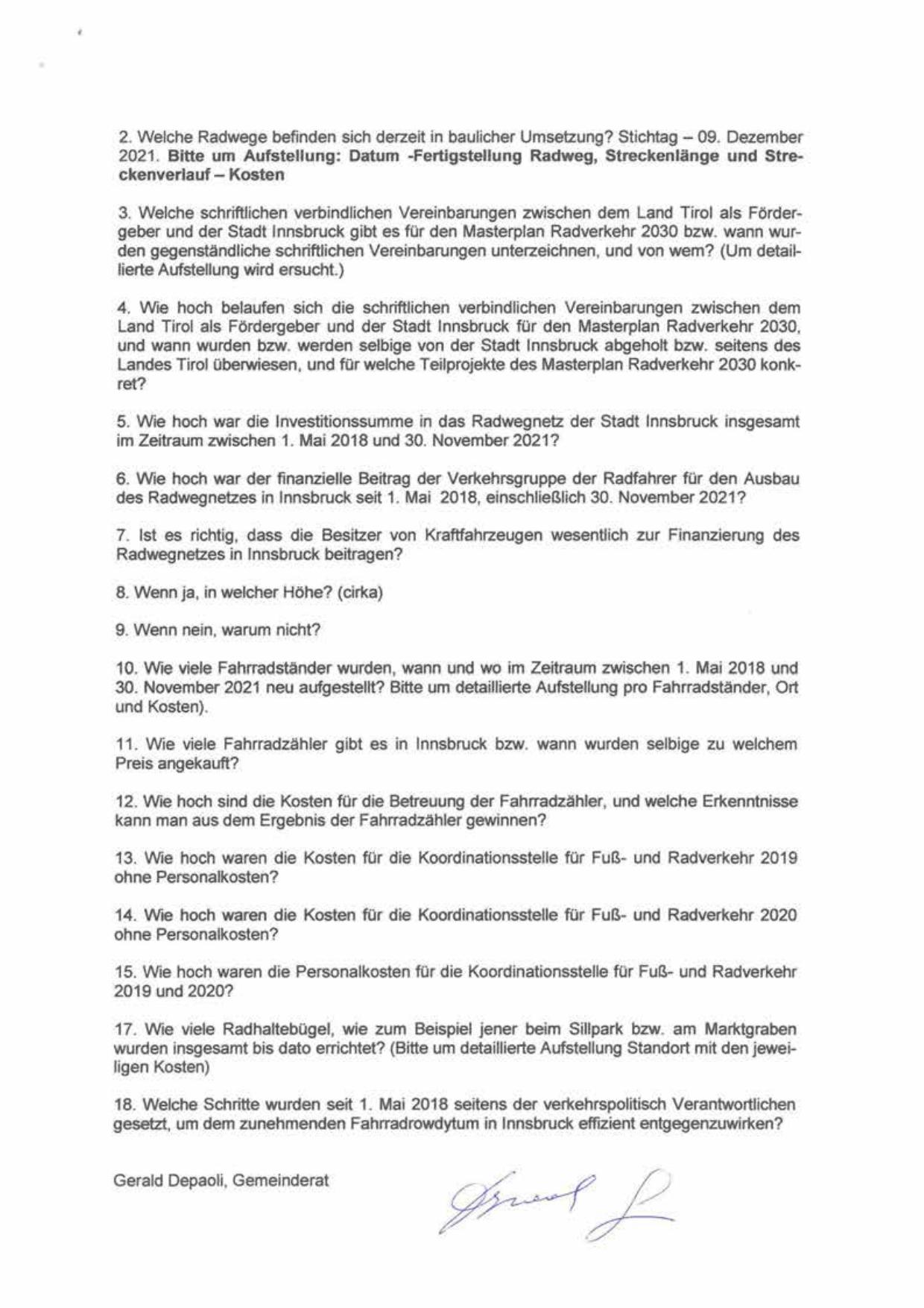 3. Welche schriftlichen verbindlichen Vereinbarungen zwischen dem Land Tirol als Fördergeber und der Stadt Innsbruck gibt es für den Masterplan Radverkehr 2030 bzw. wann wurden gegenständliche schriftlichen Vereinbarungen unterzeichnen, und von wem? (Um detaillierte Aufstellung wird ersucht.)