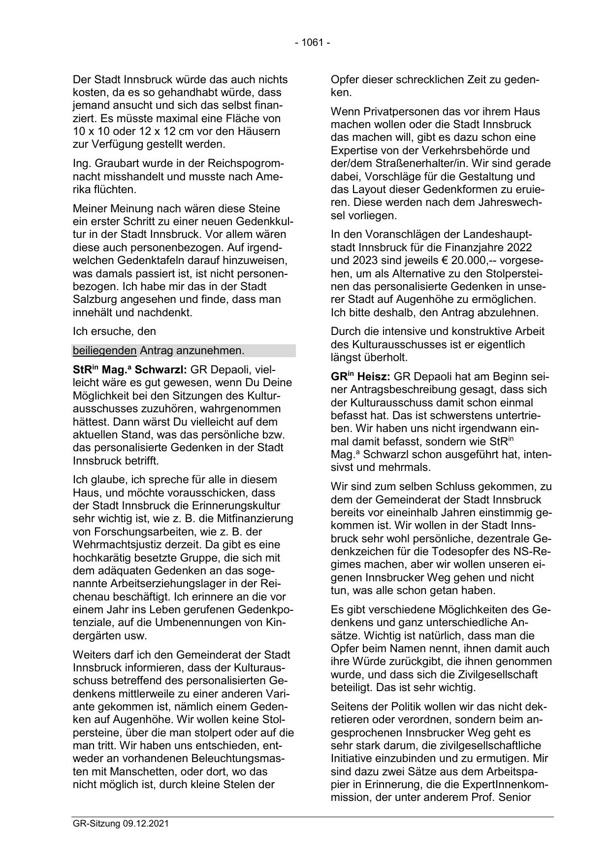 bereits vor eineinhalb Jahren einstimmig gekommen ist. Wir wollen in der Stadt Innsbruck sehr wohl persönliche, dezentrale Gedenkzeichen für die Todesopfer des NS-Regimes machen, aber wir wollen unseren eigenen Innsbrucker Weg gehen und nicht