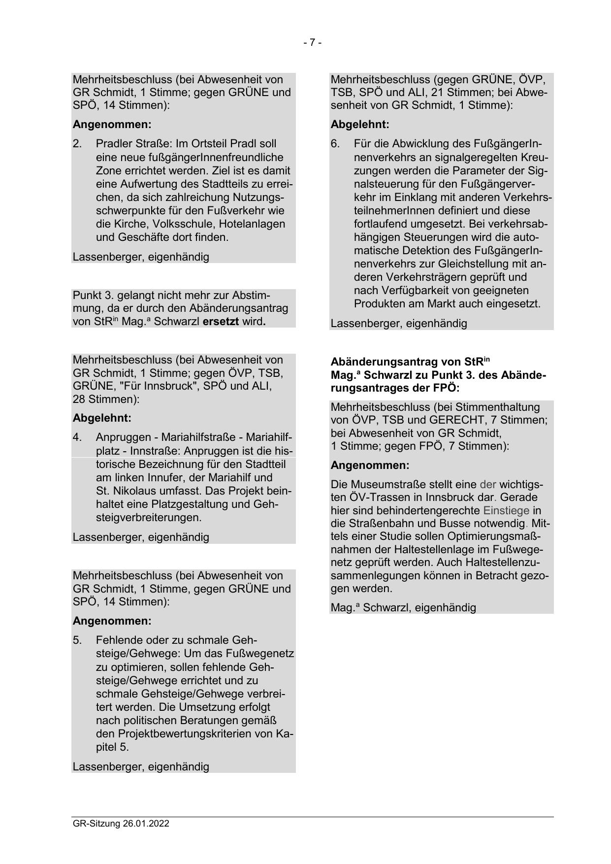 TSB, SPÖ und ALI, 21 Stimmen; bei Abwesenheit von GR Schmidt, 1 Stimme):