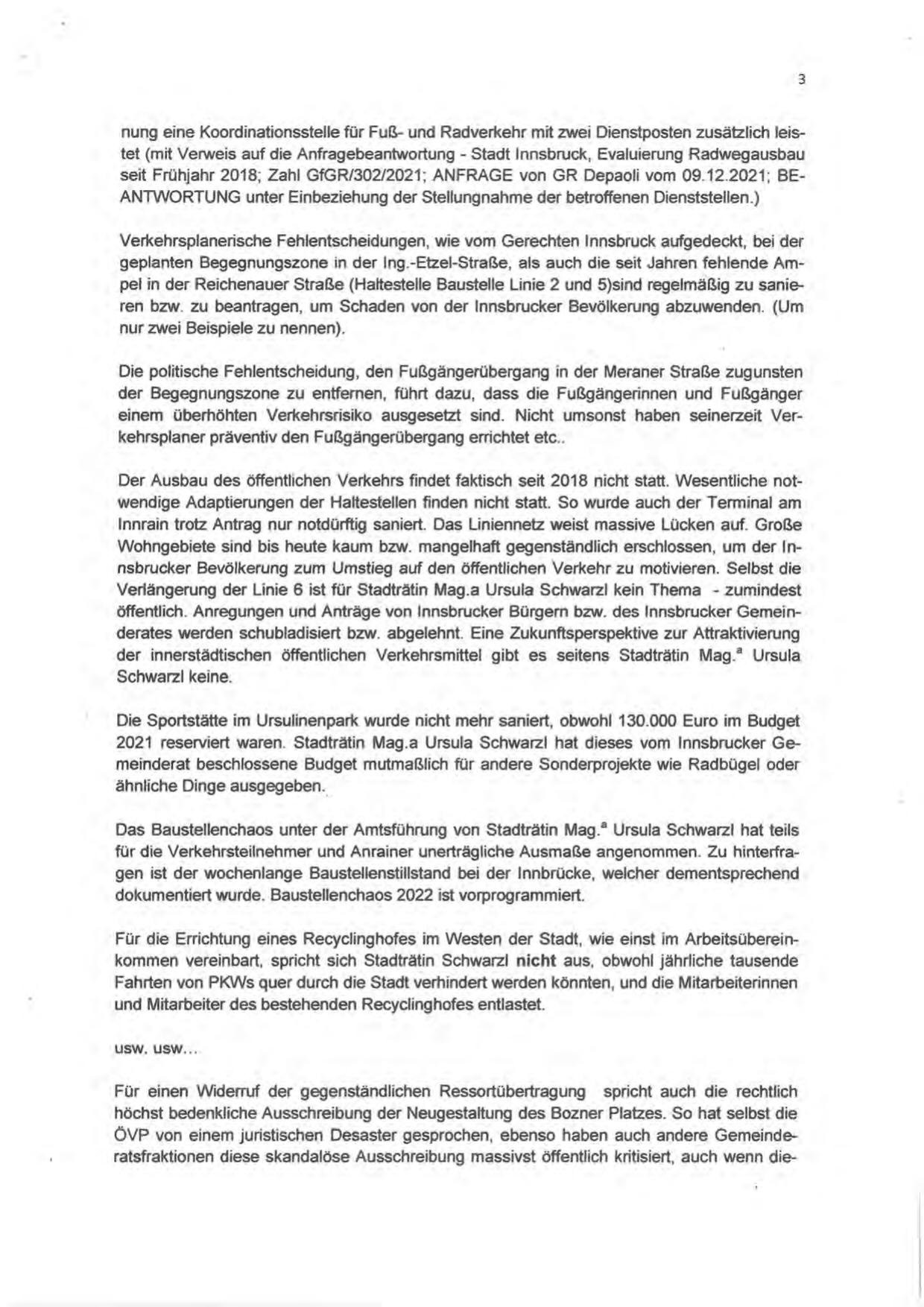2021 reserviert waren. Stadträtin Mag.a Ursula Schwarz! hat dieses vom lnnsbrucker Gemeinderat beschlossene Budget mutmaßlich für andere Sonderprojekte wie Radbügel oder