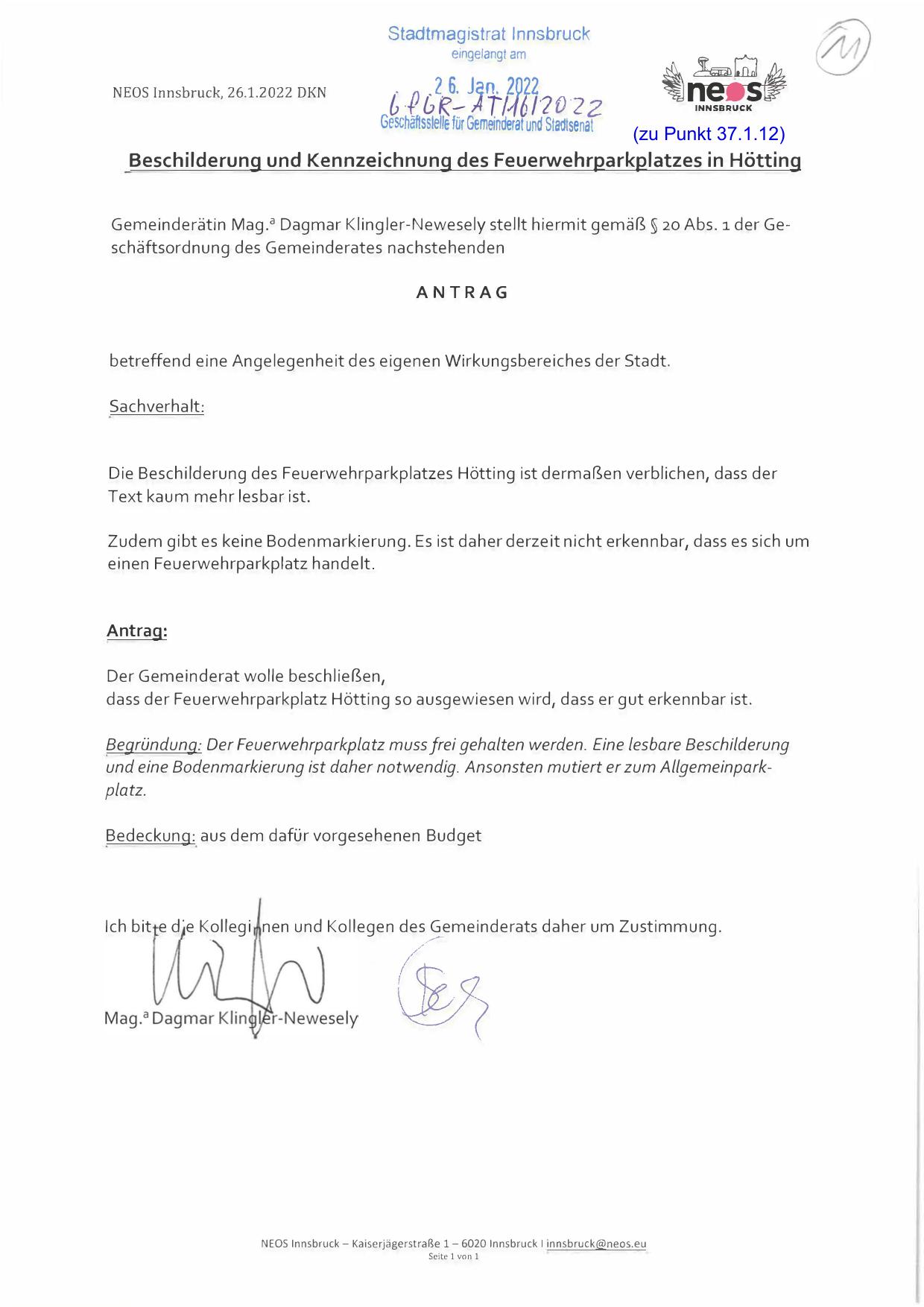 dass der Feuerwehrparkplatz Hötting so ausgewiesen wird, dass er gut erkennbar ist.