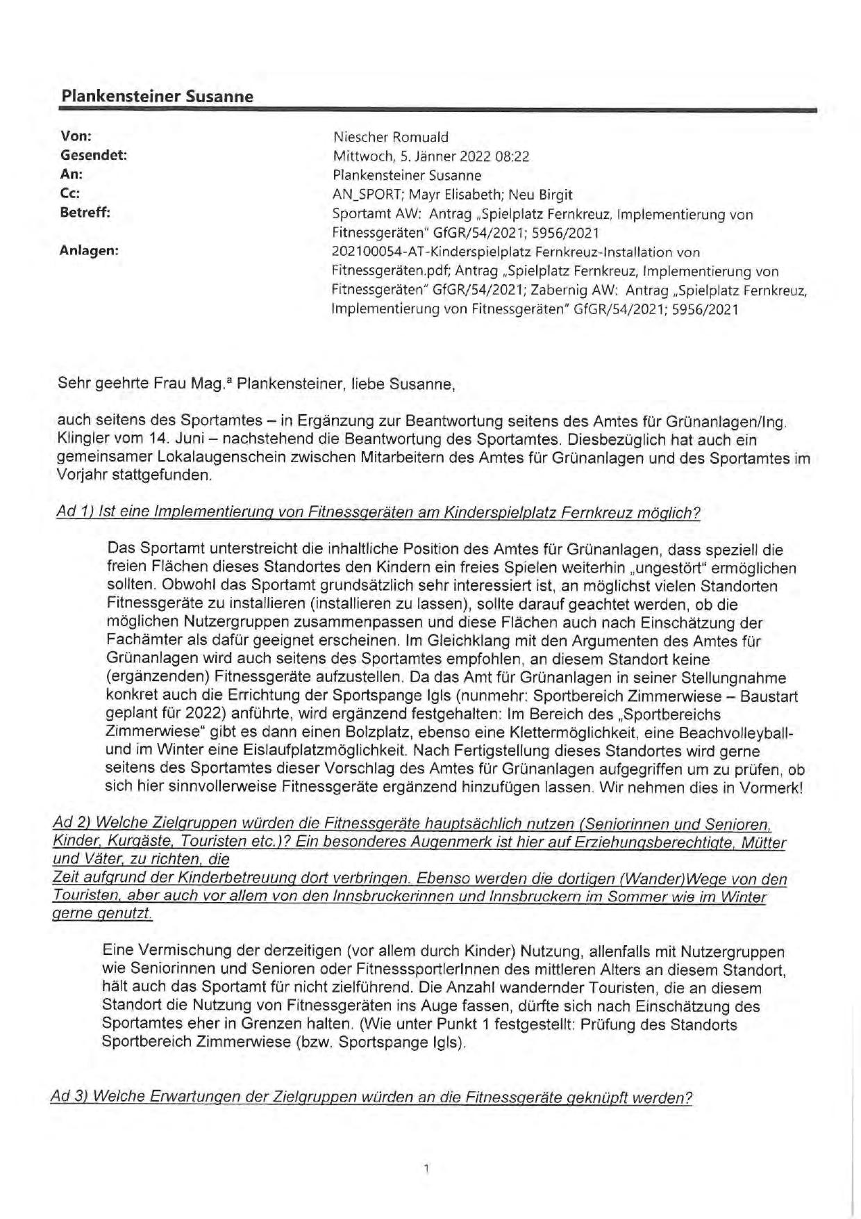 Ad 1) Ist eine Implementierung von Fitnessgeräten am Kinderspielplatz Fernkreuz möglich?