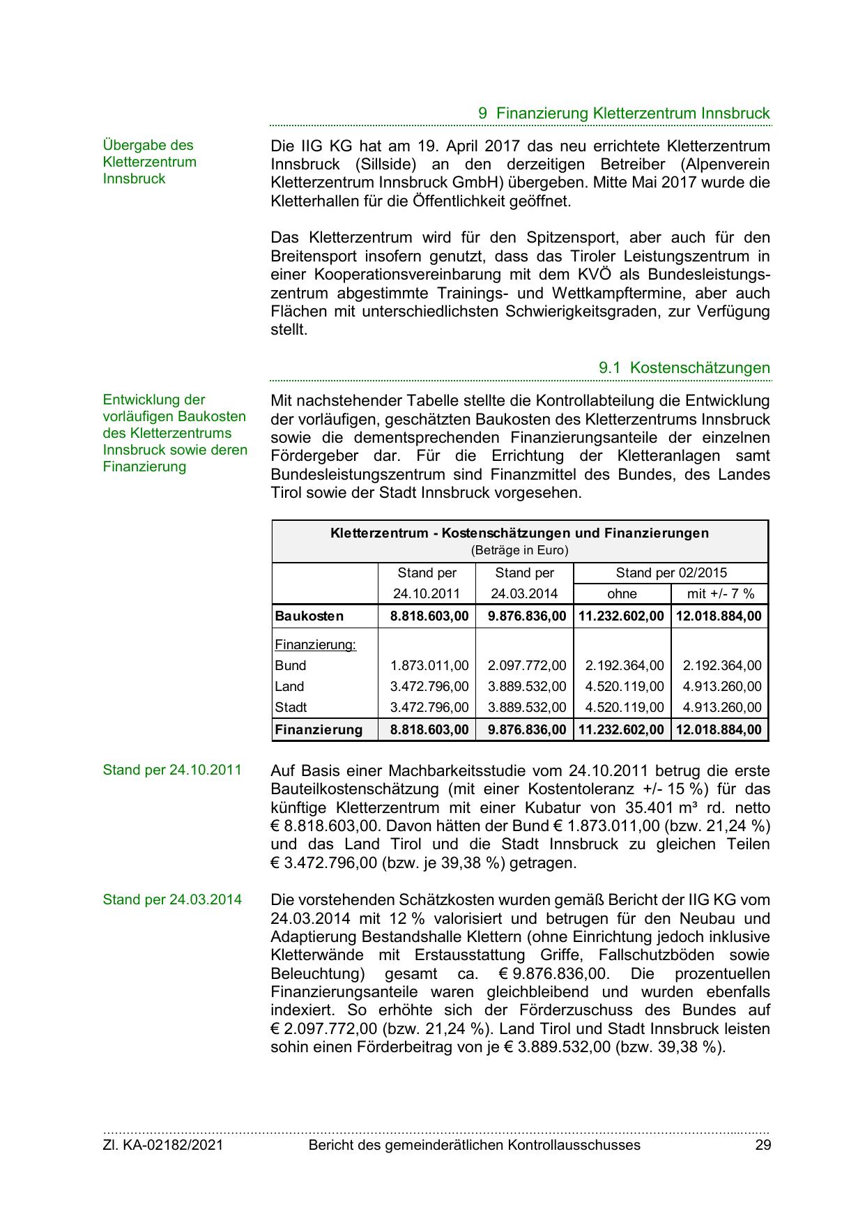 der vorläufigen, geschätzten Baukosten des Kletterzentrums Innsbruck