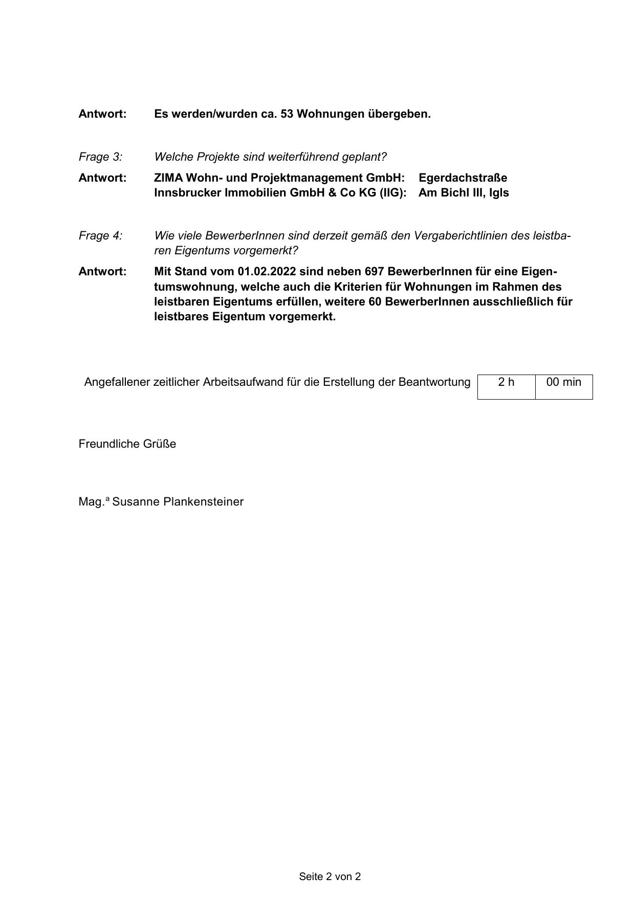 Angefallener zeitlicher Arbeitsaufwand für die Erstellung der Beantwortung