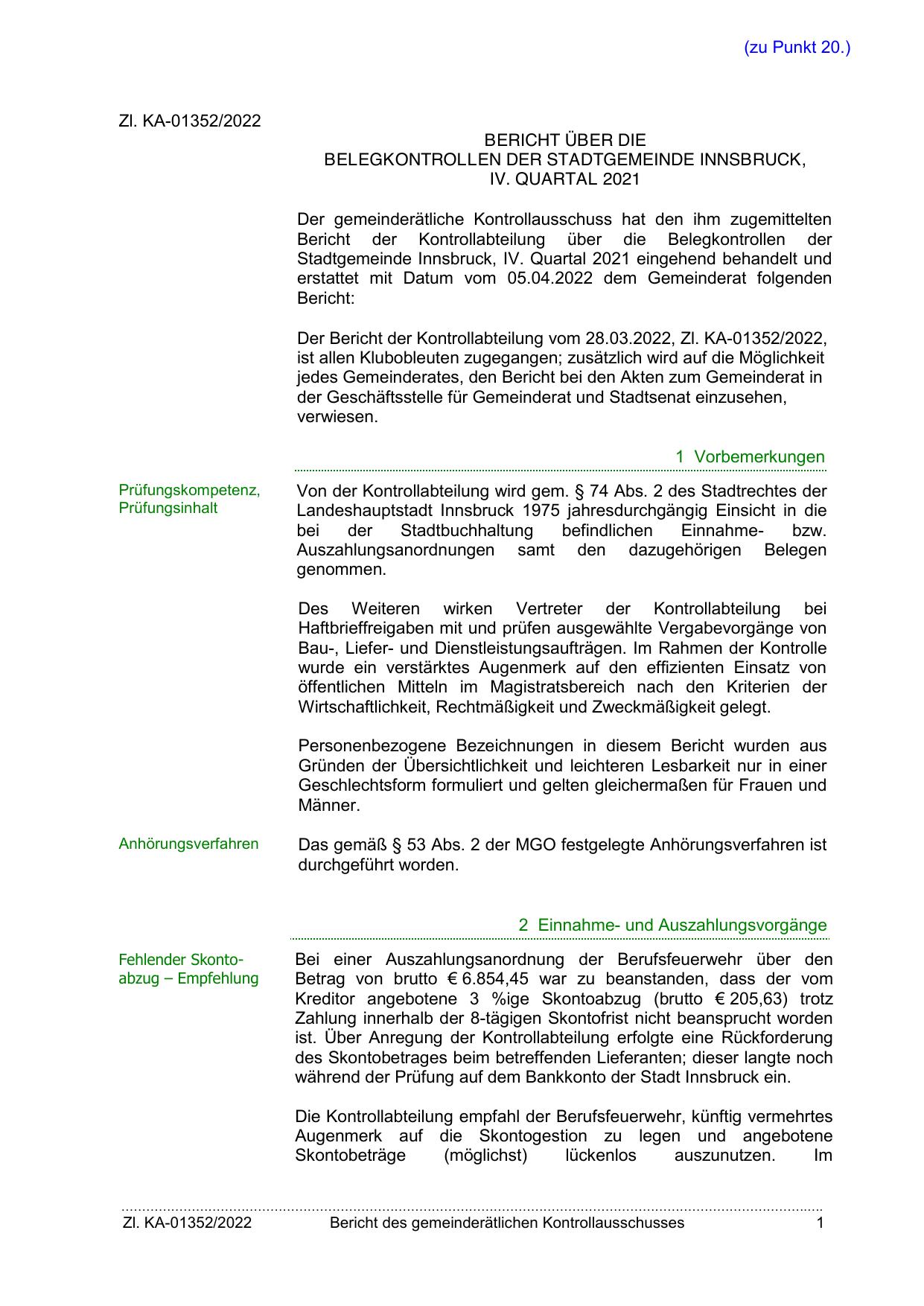 Stadtgemeinde Innsbruck, IV. Quartal 2021 eingehend behandelt und
