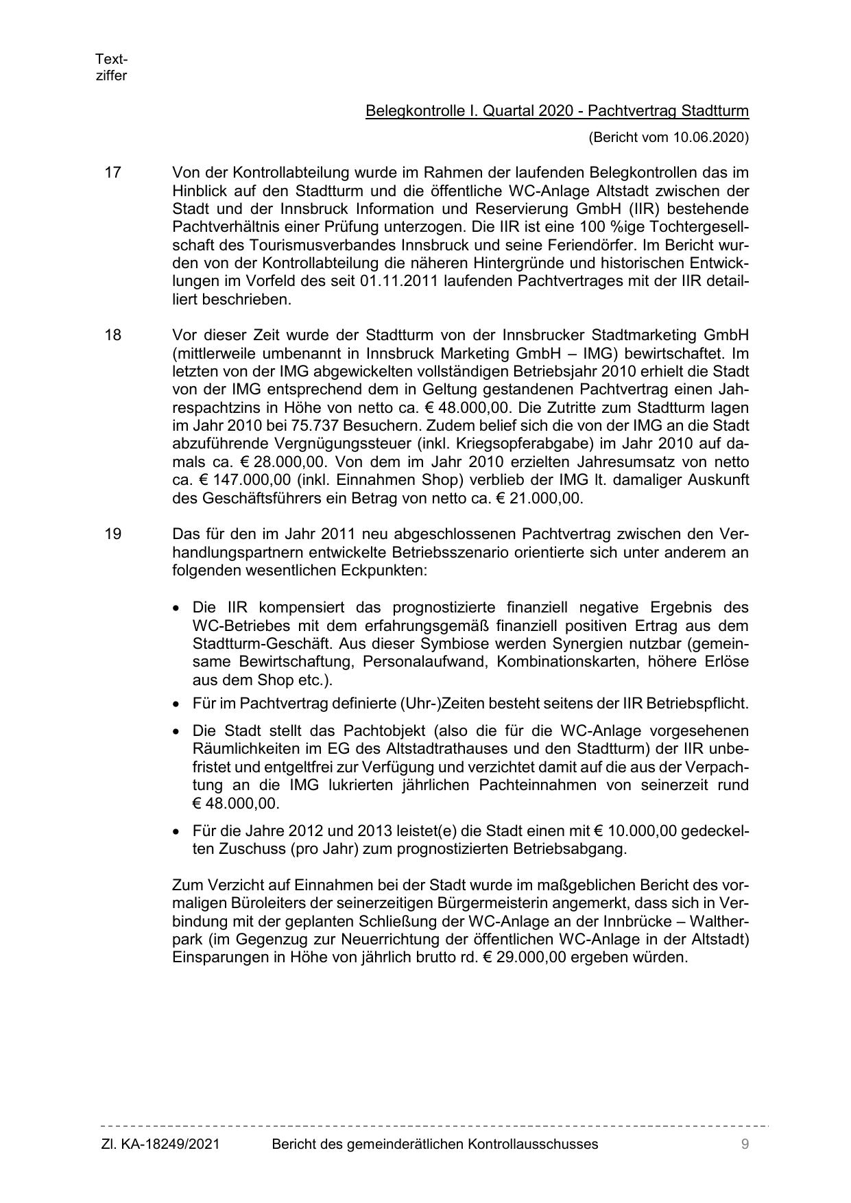 Pachtverhältnis einer Prüfung unterzogen. Die IIR ist eine 100 %ige Tochtergesellschaft des Tourismusverbandes Innsbruck und seine Feriendörfer. Im Bericht wurden von der Kontrollabteilung die näheren Hintergründe und historischen Entwicklungen im Vorfeld des seit 01.11.2011 laufenden Pachtvertrages mit der IIR detailliert beschrieben.