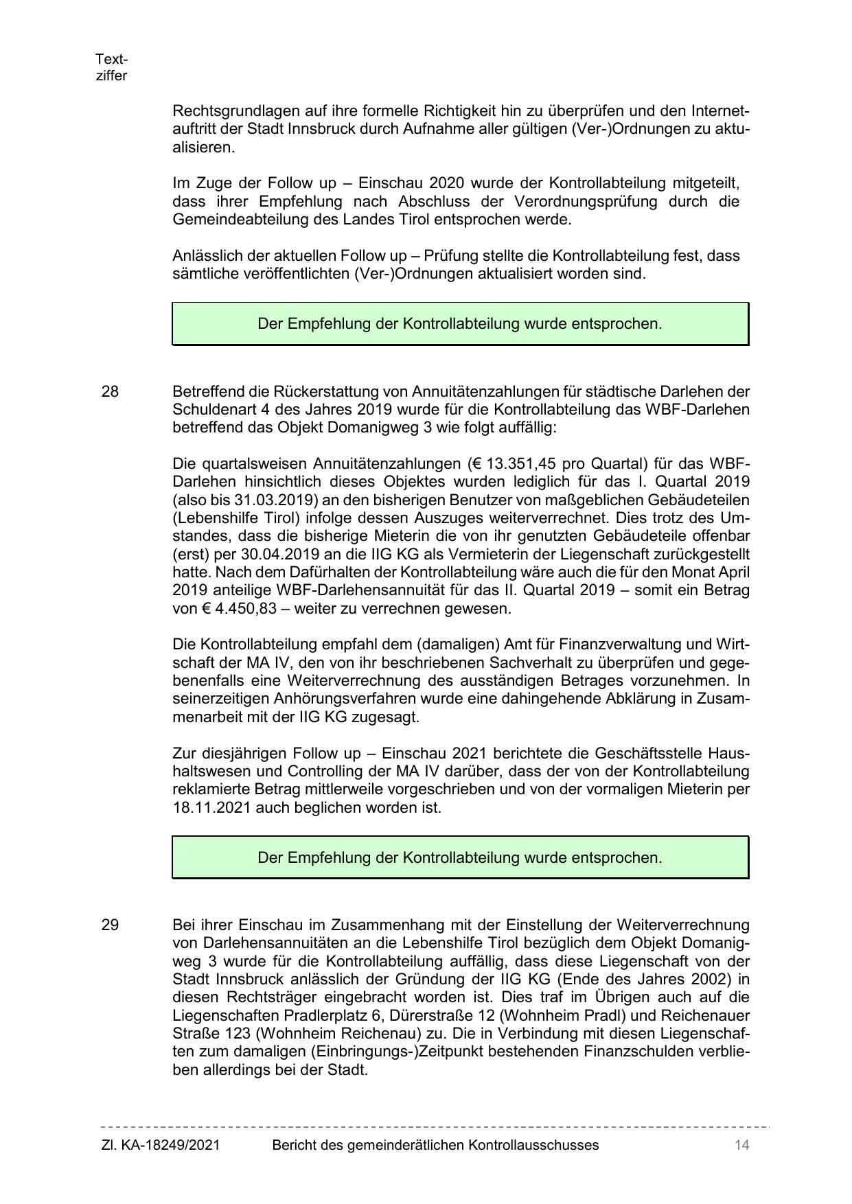 von Darlehensannuitäten an die Lebenshilfe Tirol bezüglich dem Objekt Domanigweg 3 wurde für die Kontrollabteilung auffällig, dass diese Liegenschaft von der