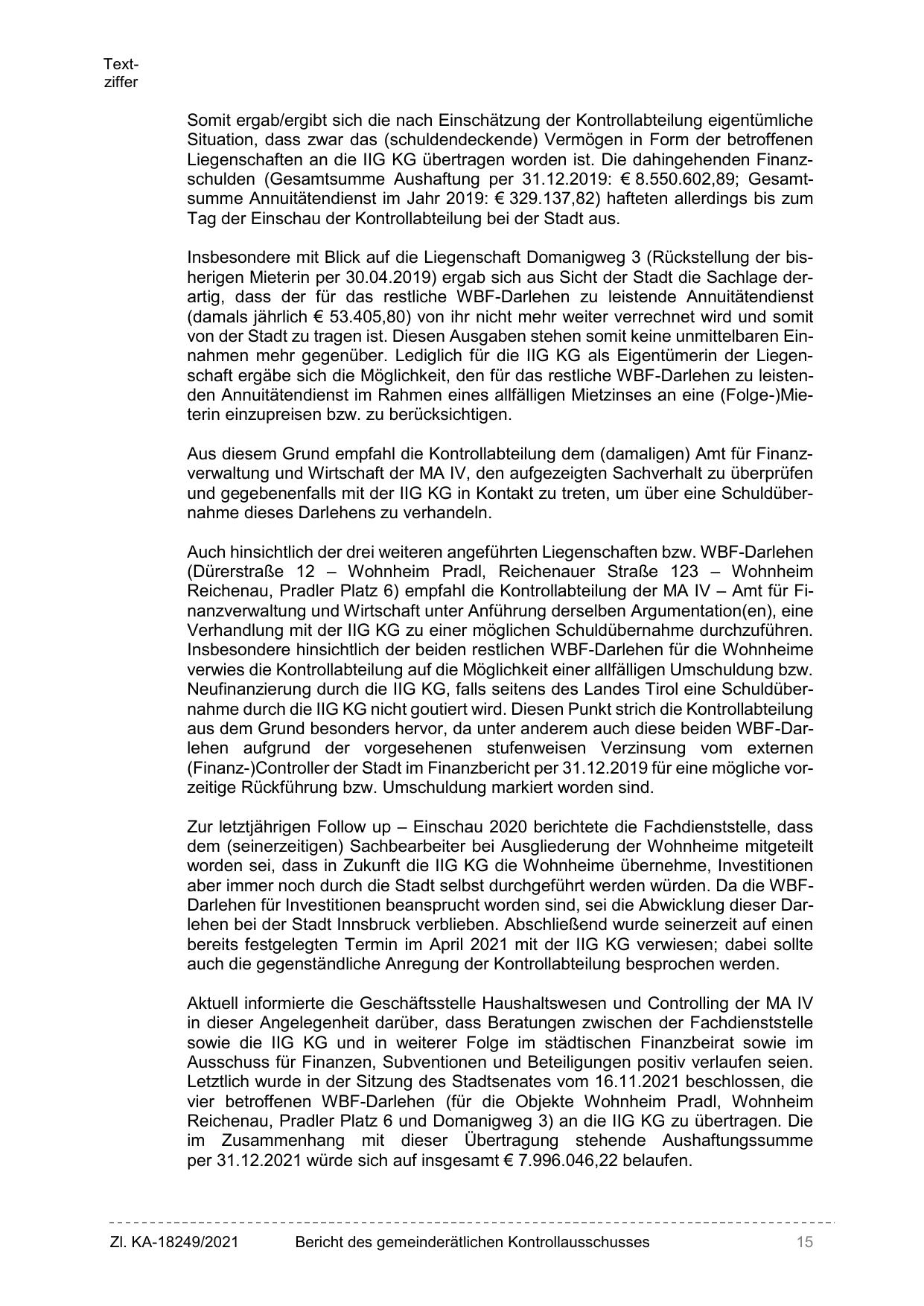 Liegenschaften an die IIG KG übertragen worden ist. Die dahingehenden Finanzschulden (Gesamtsumme Aushaftung per 31.12.2019: € 8.550.602,89; Gesamtsumme Annuitätendienst im Jahr 2019: € 329.137,82) hafteten allerdings bis zum