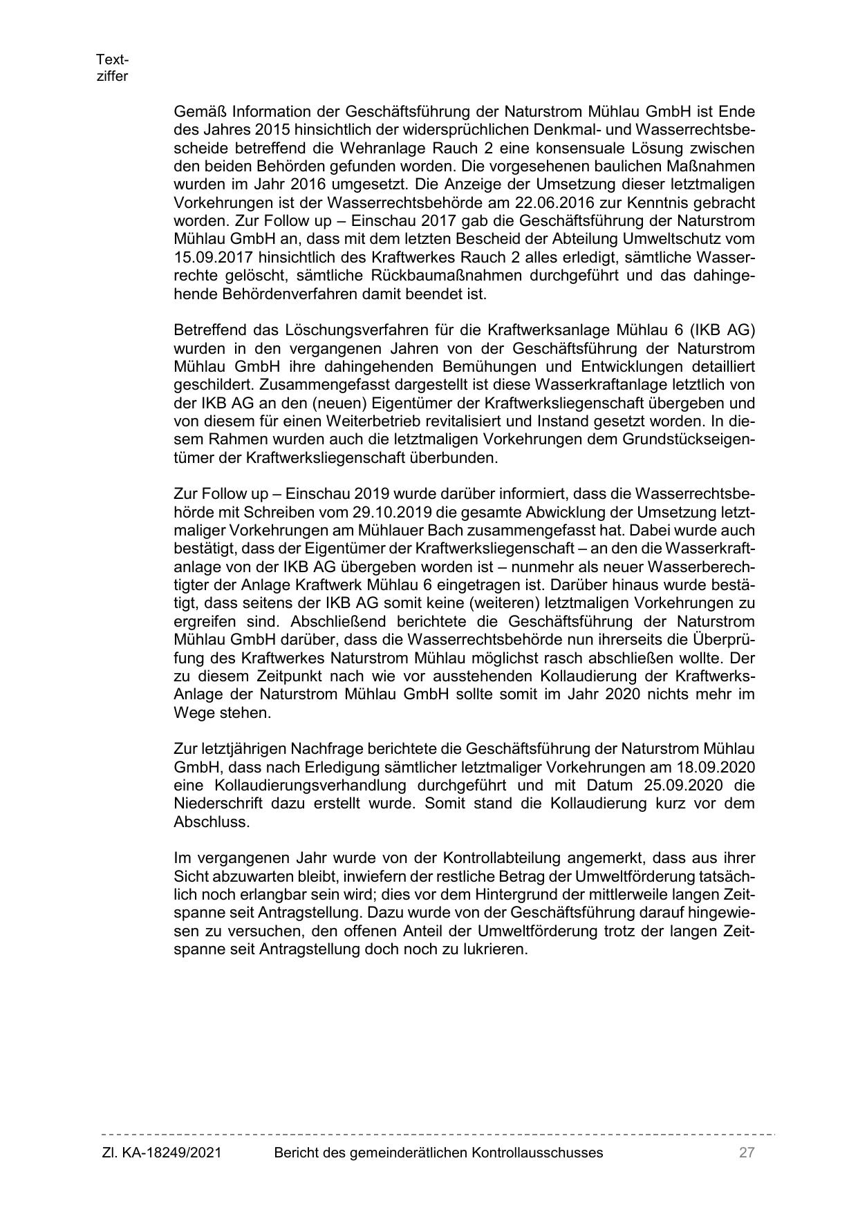 Mühlau GmbH darüber, dass die Wasserrechtsbehörde nun ihrerseits die Überprüfung des Kraftwerkes Naturstrom Mühlau möglichst rasch abschließen wollte. Der