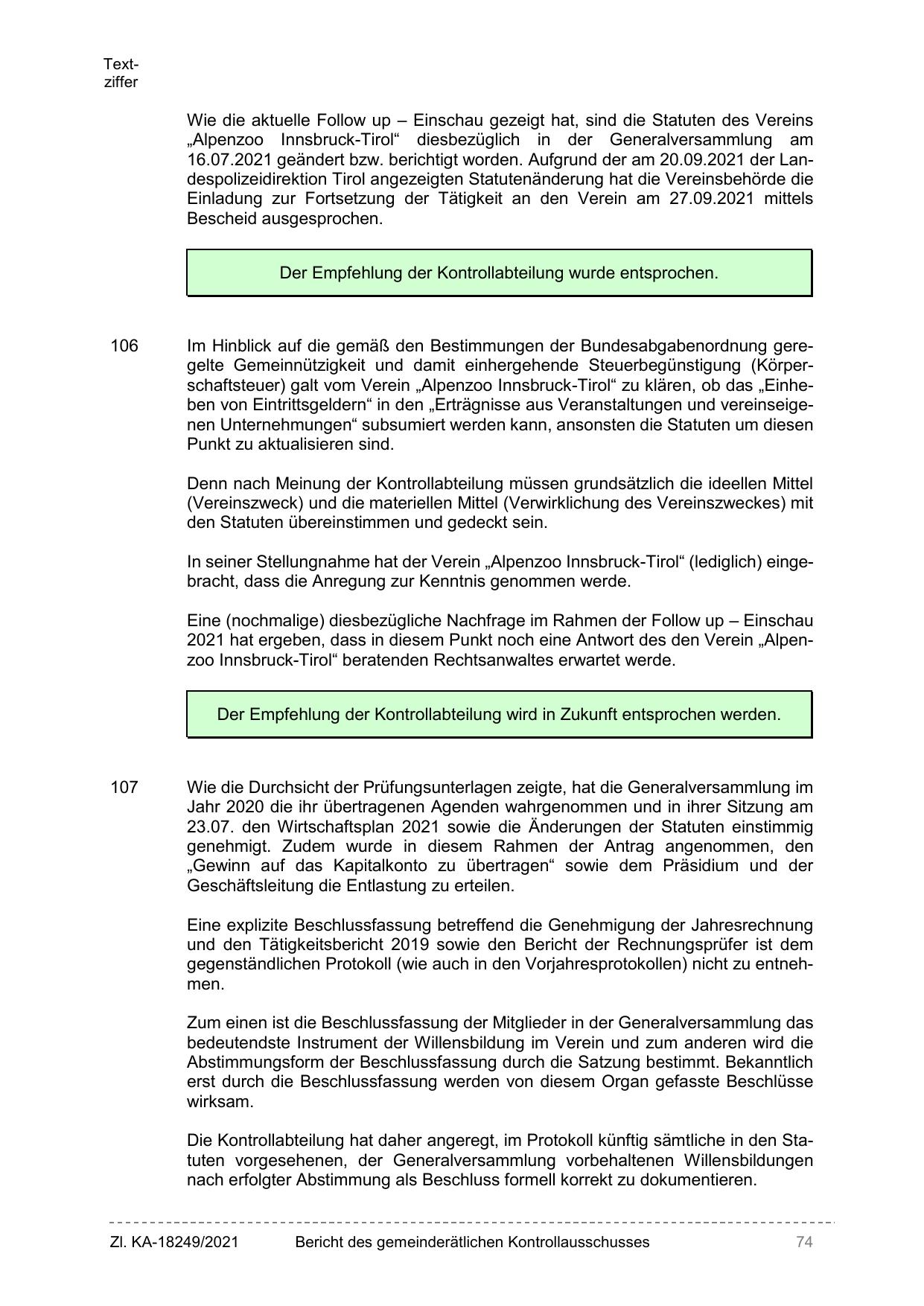 2021 hat ergeben, dass in diesem Punkt noch eine Antwort des den Verein „Alpenzoo Innsbruck-Tirol“ beratenden Rechtsanwaltes erwartet werde.