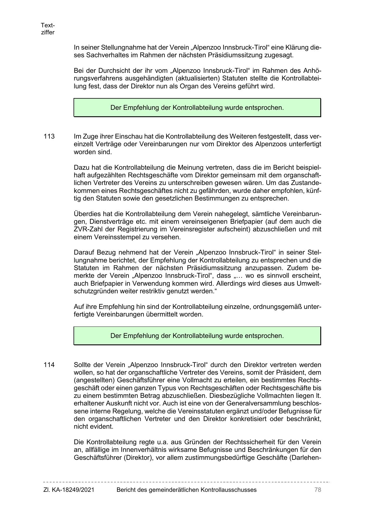 Darauf Bezug nehmend hat der Verein „Alpenzoo Innsbruck-Tirol“ in seiner Stellungnahme berichtet, der Empfehlung der Kontrollabteilung zu entsprechen und die