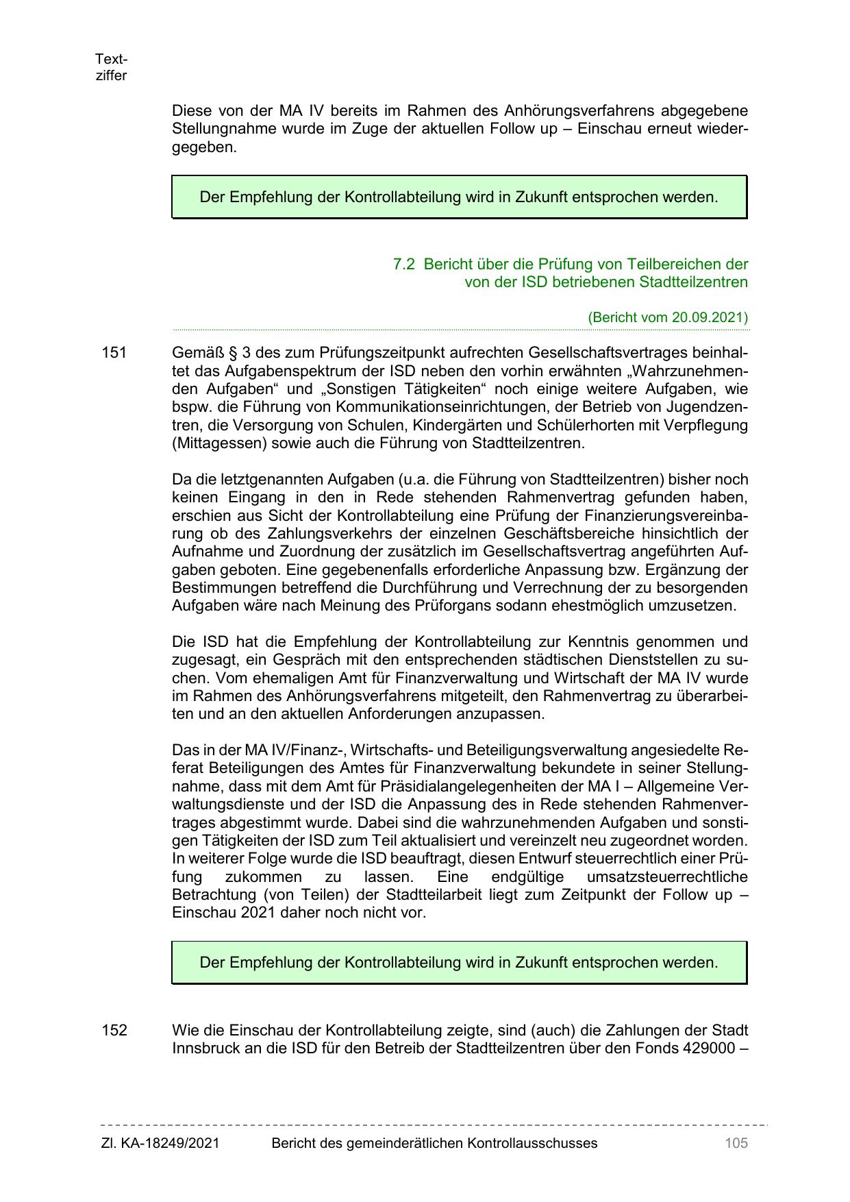 Das in der MA IV/Finanz-, Wirtschafts- und Beteiligungsverwaltung angesiedelte Referat Beteiligungen des Amtes für Finanzverwaltung bekundete in seiner Stellungnahme, dass mit dem Amt für Präsidialangelegenheiten der MA I – Allgemeine Verwaltungsdienste und der ISD die Anpassung des in Rede stehenden Rahmenvertrages abgestimmt wurde. Dabei sind die wahrzunehmenden Aufgaben und sonstigen Tätigkeiten der ISD zum Teil aktualisiert und vereinzelt neu zugeordnet worden.