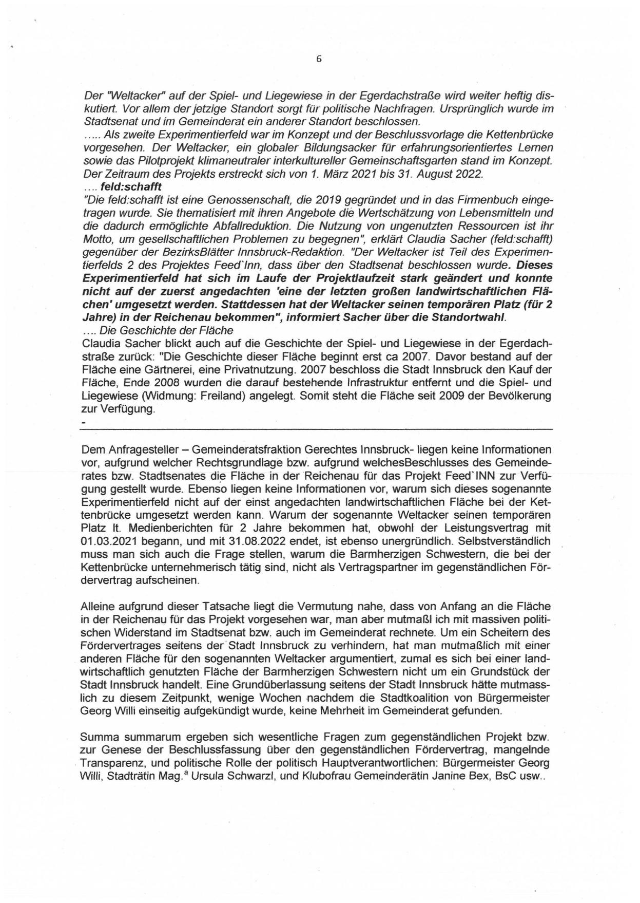 vor, aufgrund welcher Rechtsgrundlage bzw. aufgrund welchesBeschlusses des Gemeinderates bzw. Stadtsenates die Fläche in der Reichenau für das Projekt Feed" INN zur Verfügung gestellt wurde. Ebenso liegen keine Informationen vor, warum sich dieses sogenannte