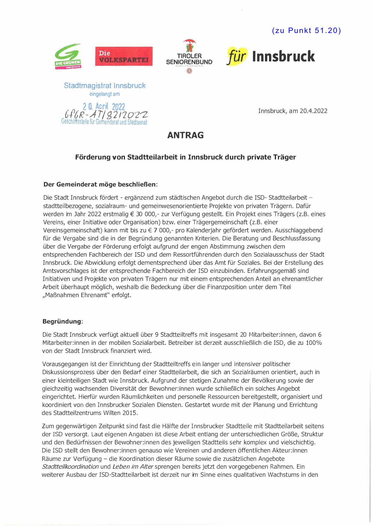 Die Stadt I n nsbruck fördert - ergä nzend z u m städtischen Angebot d u rch d ie ISD- Stadtteilarbeit stadtteil bezogene, sozia l ra u m - u n d gemei nwesenorientierte Projekte von p rivaten Trägern . Dafü r