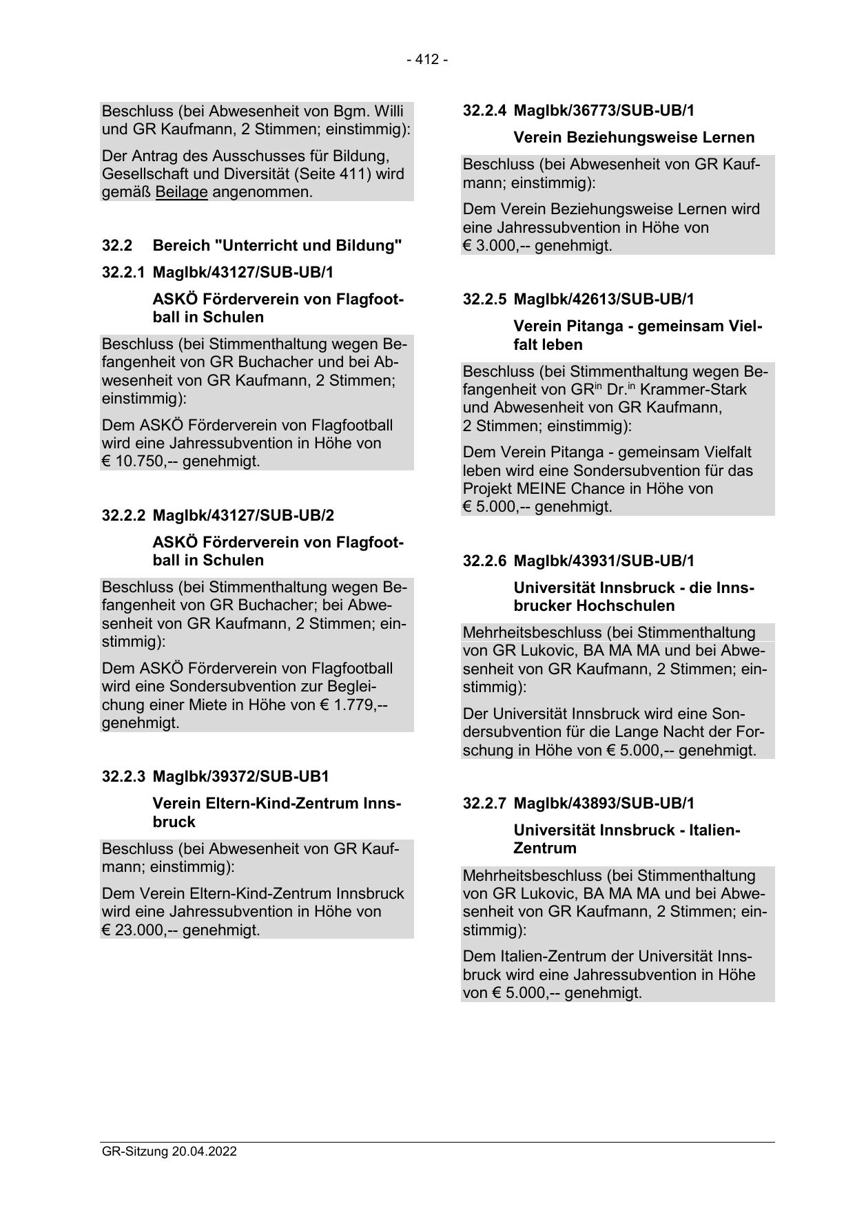 Beschluss (bei Stimmenthaltung wegen Befangenheit von GR Buchacher; bei Abwesenheit von GR Kaufmann, 2 Stimmen; einstimmig):