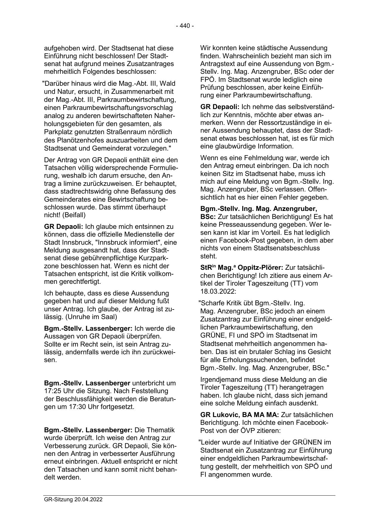 Meldung ausgesandt hat, dass der Stadtsenat diese gebührenpflichtige Kurzparkzone beschlossen hat. Wenn es nicht der