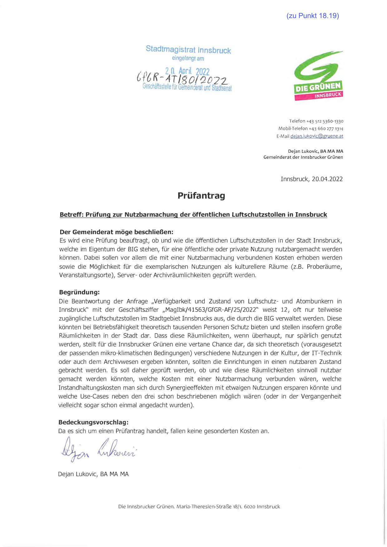 Betreff: Prüfu ng zur N utzba rmachung der öffentl ichen Luftsch utzstol len i n I n n sbruck